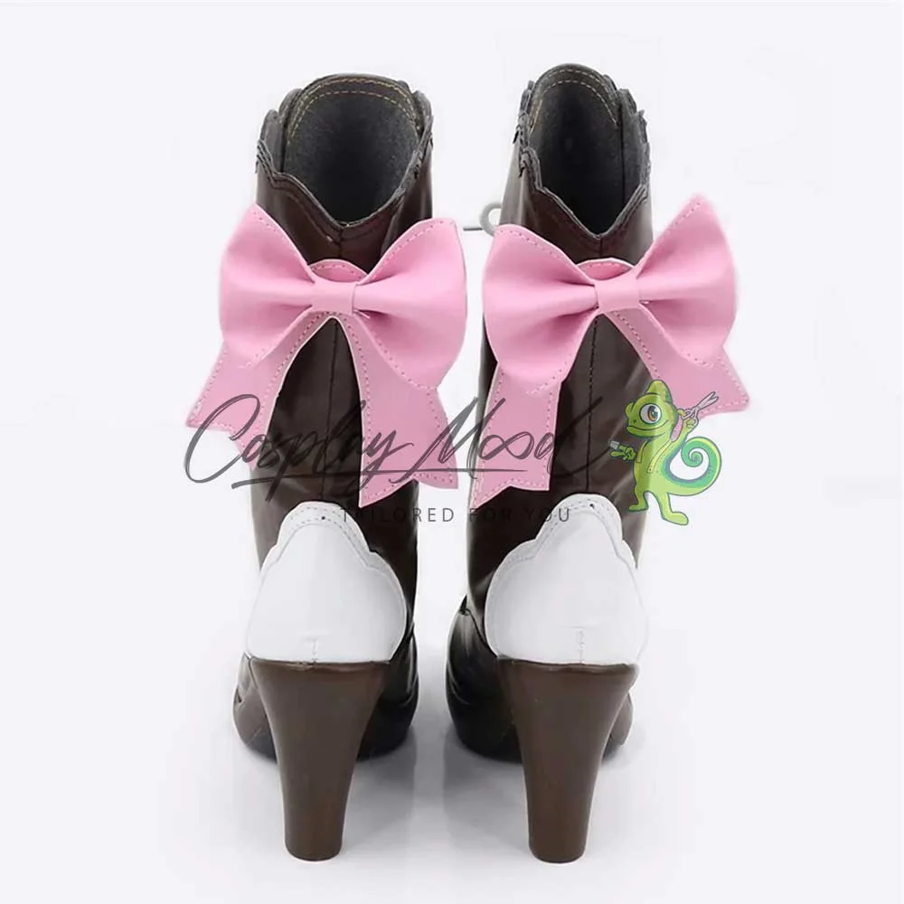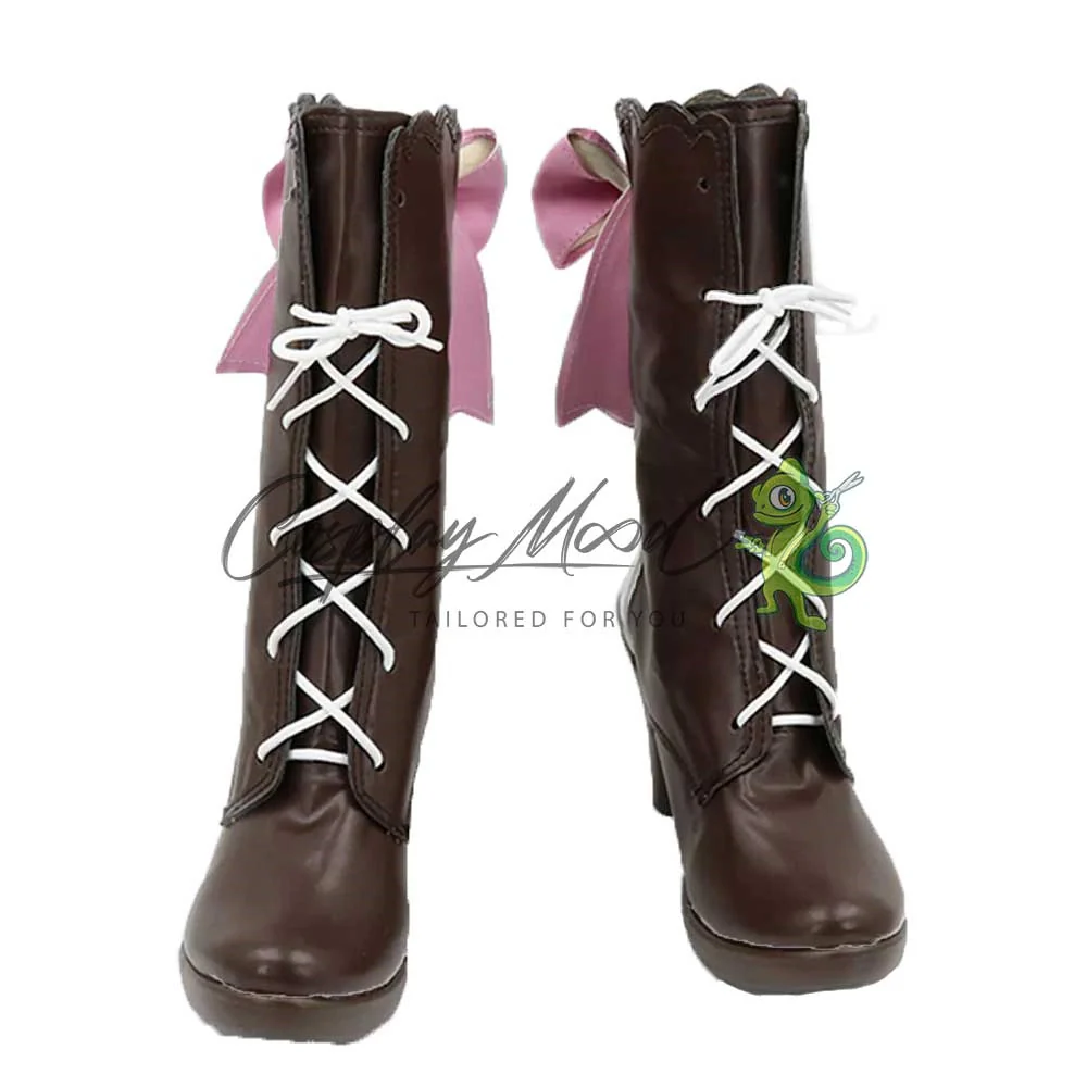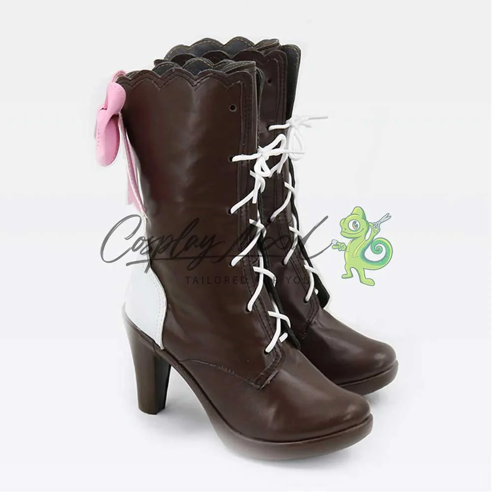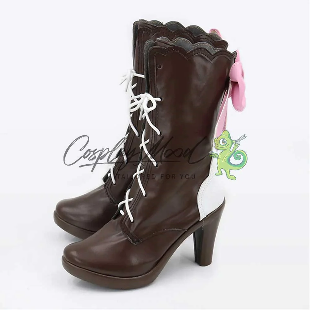 Gli stivali sono realizzati in pelle PU e lavorati con dettagli tipici del personaggio in questione. Questo tipo di calzature sono resistenti ad urti e strappi ed appariranno come da immagine: un paio di stivali marrone scuro con stringhe bianche e tallone dello stesso colore. Sempre nella parte posteriore si trova un vistoso fiocco rosa, completa una decorazione ad onda nella zona terminale alta degli stivali. Gli stivali cosplay sono fatti su ordinazione, quando il laboratorio finisce di realizzarli verranno spediti immediatamente. Potrebbe accadere che alcuni tipi di scarpe o stivali all’inizio possano avere un forte odore che per alcune persone potrebbe risultare sgradevole. Questa cosa si risolverà facilmente mettendo le scarpe o gli stivali in un luogo areato per qualche giorno.