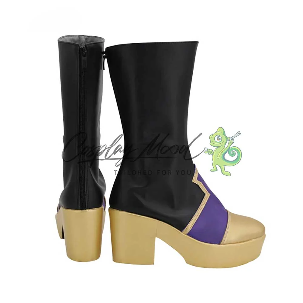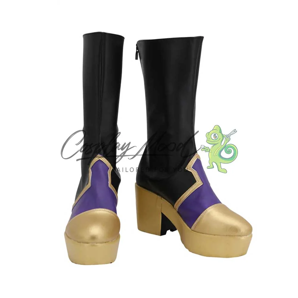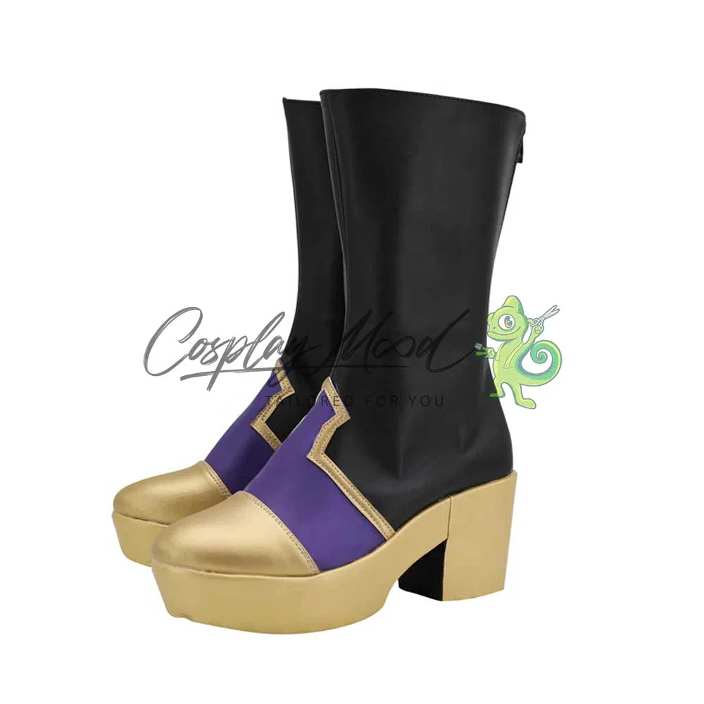 Gli stivali sono realizzati in pelle PU e lavorati con dettagli tipici del personaggio in questione. Questo tipo di calzature sono resistenti ad urti e strappi ed appariranno come da immagine: un paio di stivaletti neri con punta, suola e tacco dorati e una decorazione viola, sempre bordata di dorato sul fronte. Gli stivali cosplay sono realizzati su ordinazione, quando il laboratorio finisce di produrli verranno spediti immediatamente al destinatario. All’inizio, potrebbe accadere che alcuni tipi di scarpe o stivali possano emanare un forte odore che per alcune persone potrebbe risultare sgradevole. L’inconveniente si risolverà facilmente mettendo le scarpe o gli stivali in un luogo areato per una sera o al massimo qualche giorno.