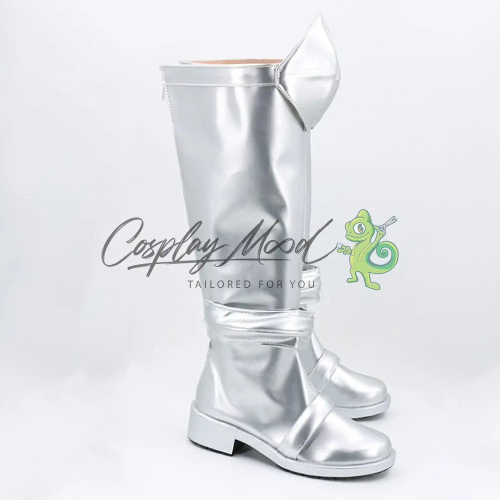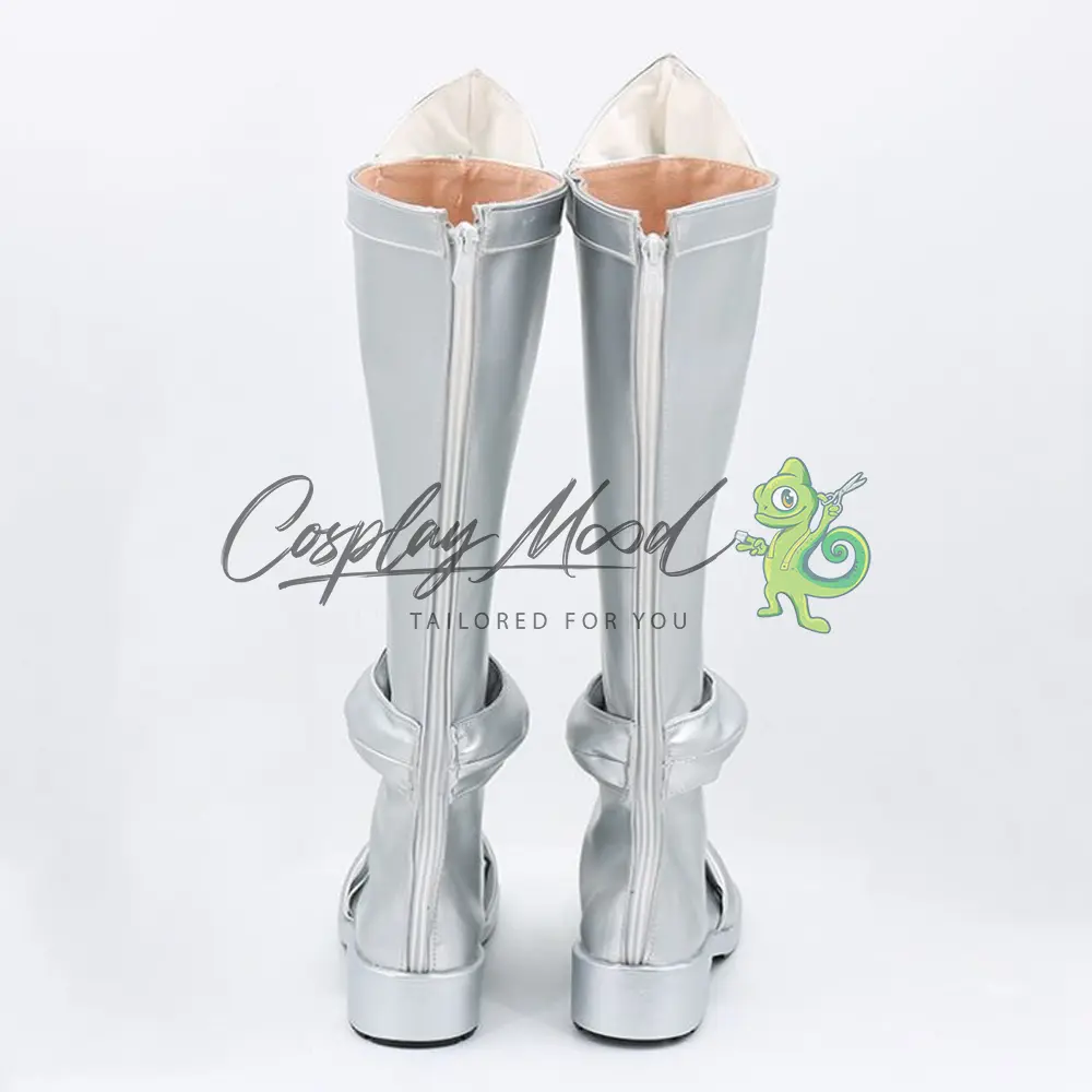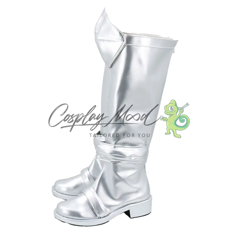 Le scarpe sono realizzate in pelle PU e lavorate con dettagli tipici del personaggio in questione. Questo tipo di calzature sono resistenti ad urti e strappi ed appariranno come da immagine: un paio di stivali lunghi argentati con tacco e rinforzo all’altezza del ginocchio, decorazioni circolari dello stesso colore poste alla caviglia e sul collo del piede. Gli stivali cosplay sono fatti su ordinazione, quando il laboratorio finisce di realizzarli verranno spediti immediatamente. Potrebbe accadere che alcuni tipi di scarpe o stivali all’inizio possano avere un forte odore che per alcune persone potrebbe risultare sgradevole. Questa cosa si risolverà facilmente mettendo le scarpe o gli stivali in un luogo areato per qualche giorno.