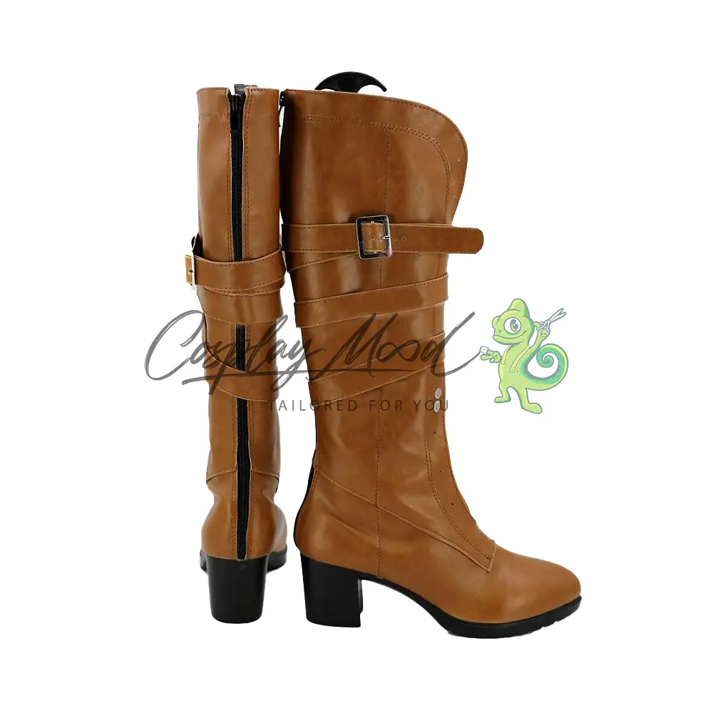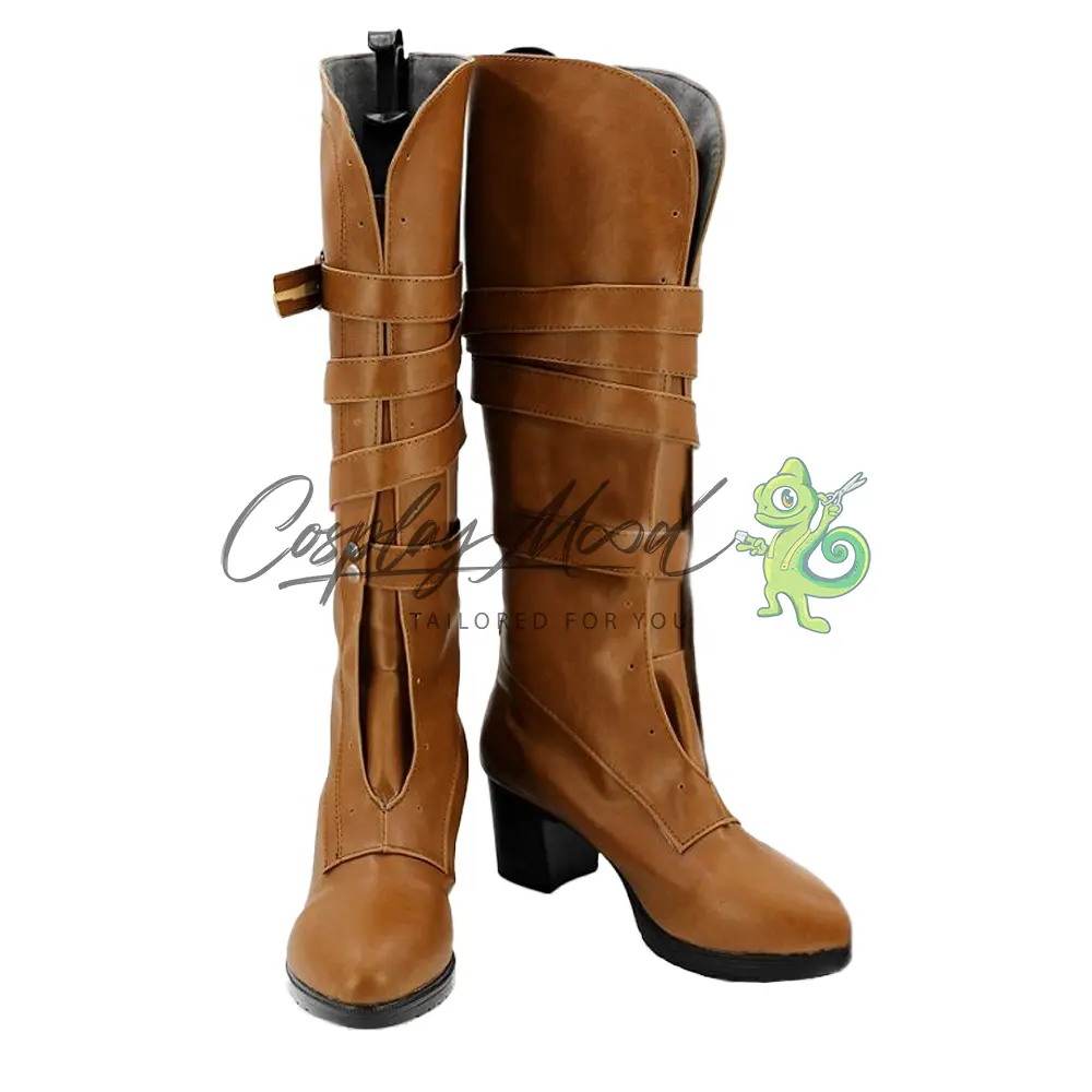 Le scarpe sono realizzate in pelle PU e lavorate con dettagli tipici del personaggio in questione. Questo tipo di calzature sono resistenti ad urti e strappi ed appariranno come da immagine: un paio di stivali lunghi marrone chiaro con tacco e suola neri e lacci sul fronte chiusi al fianco con una fibbia argentata, la parte alta risulta aperta, così come è presente sul fronte una tasca disposta verticalmente.