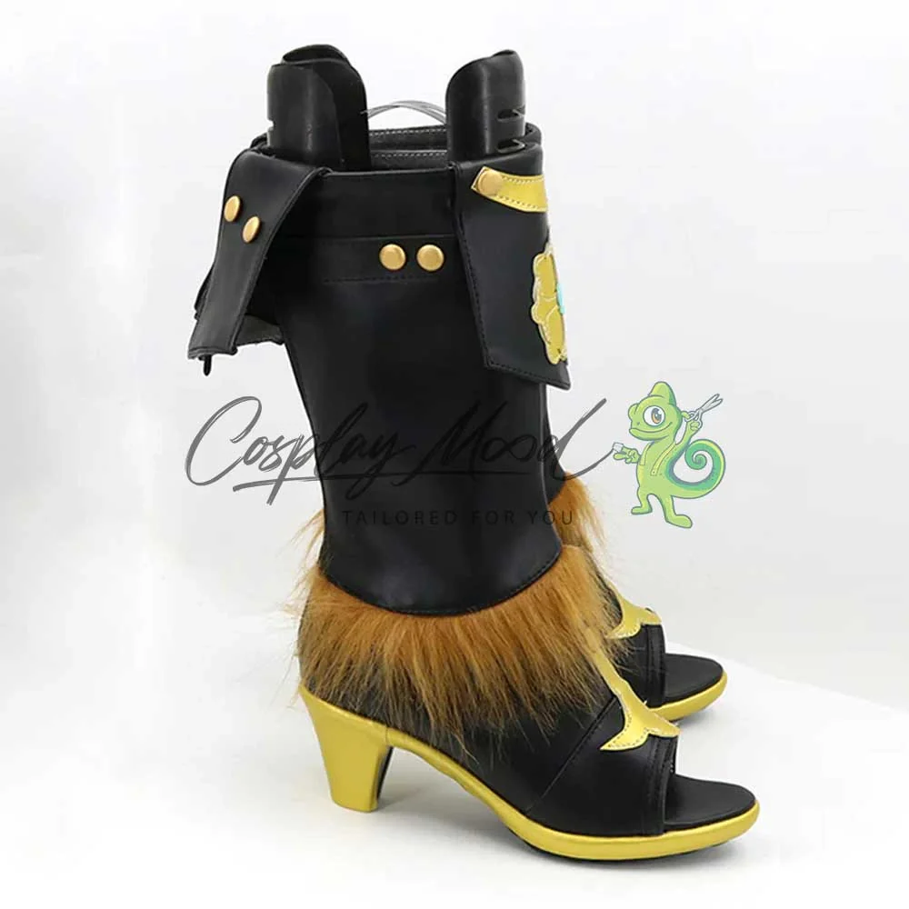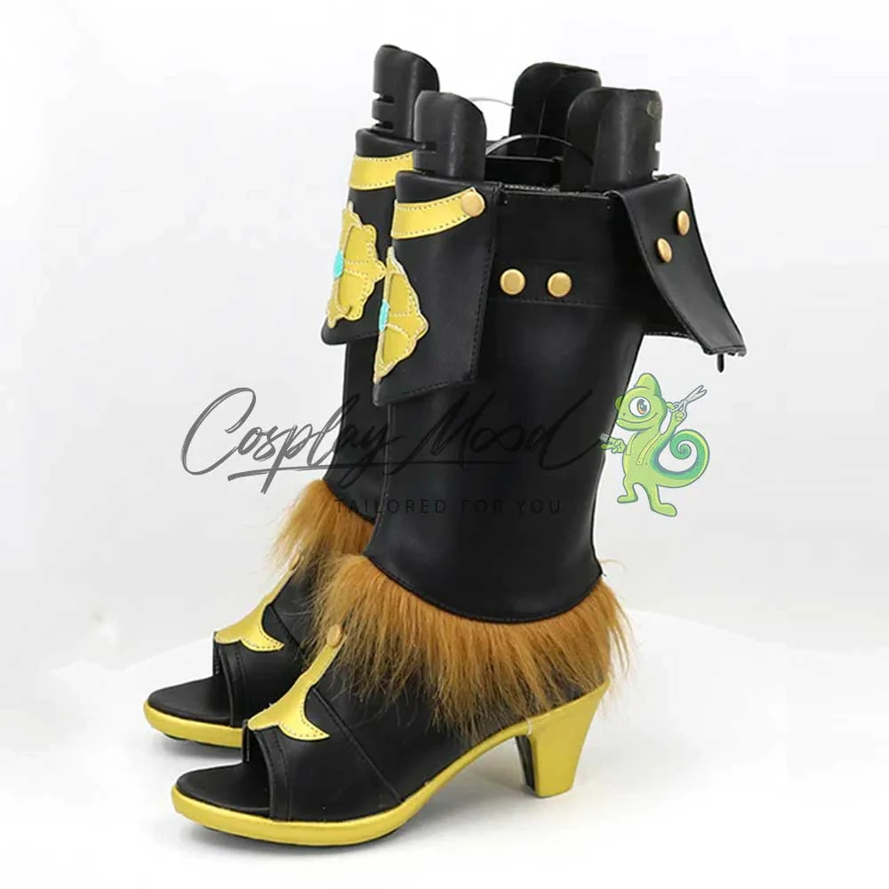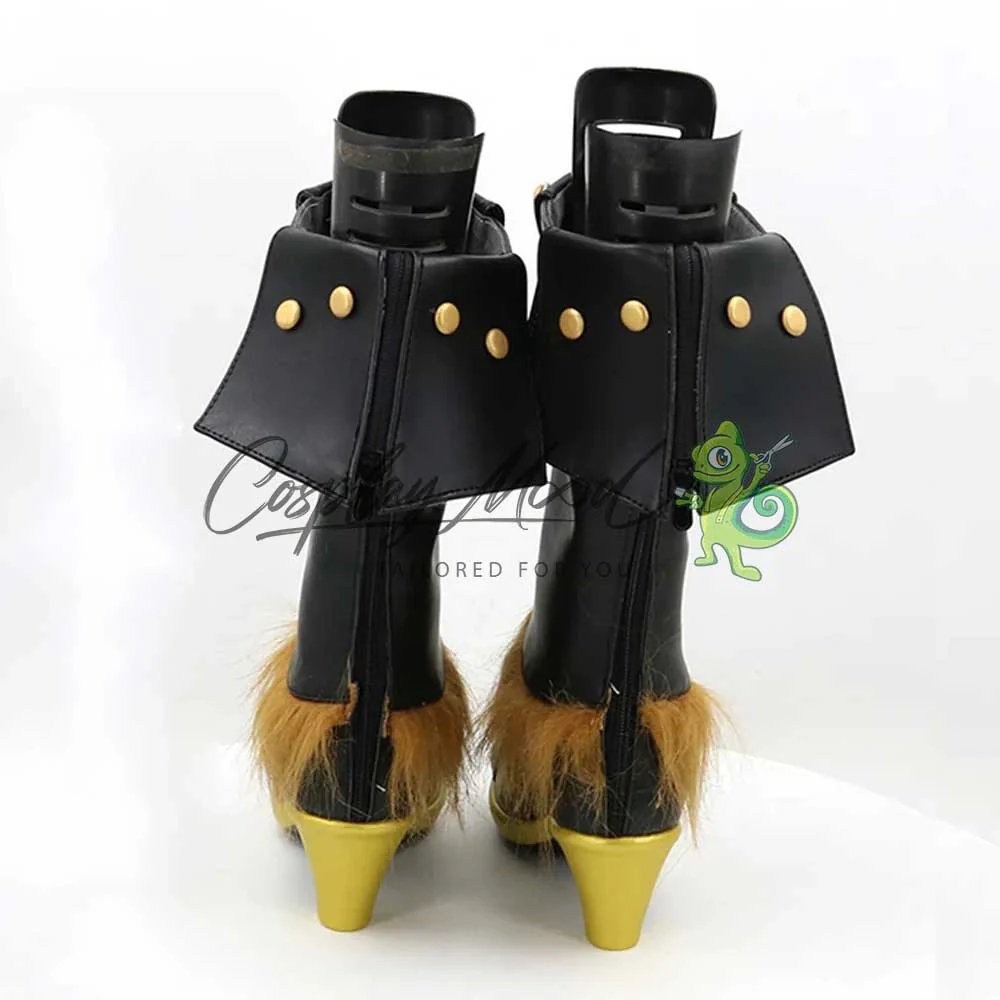 Gli stivali sono realizzati in pelle PU e lavorati con dettagli tipici del personaggio in questione. Questo tipo di calzature sono resistenti ad urti e strappi ed appariranno come da immagine: un paio di stivali lunghi neri con apertura frontale per le dita. Il risvolto alto presenta decorazioni dorate ed azzurre corredate anche da bottoncini posti in varie zone. Il tacco e la parte frontale sono sempre dorate e nella parte sopra è posto del peloncino di colore marrone. Gli stivali cosplay sono fatti su ordinazione, quando il laboratorio finisce di realizzarli verranno spediti immediatamente. Potrebbe accadere che alcuni tipi di scarpe o stivali all’inizio possano avere un forte odore che per alcune persone potrebbe risultare sgradevole. Questa cosa si risolverà facilmente mettendo le scarpe o gli stivali in un luogo areato per qualche giorno.