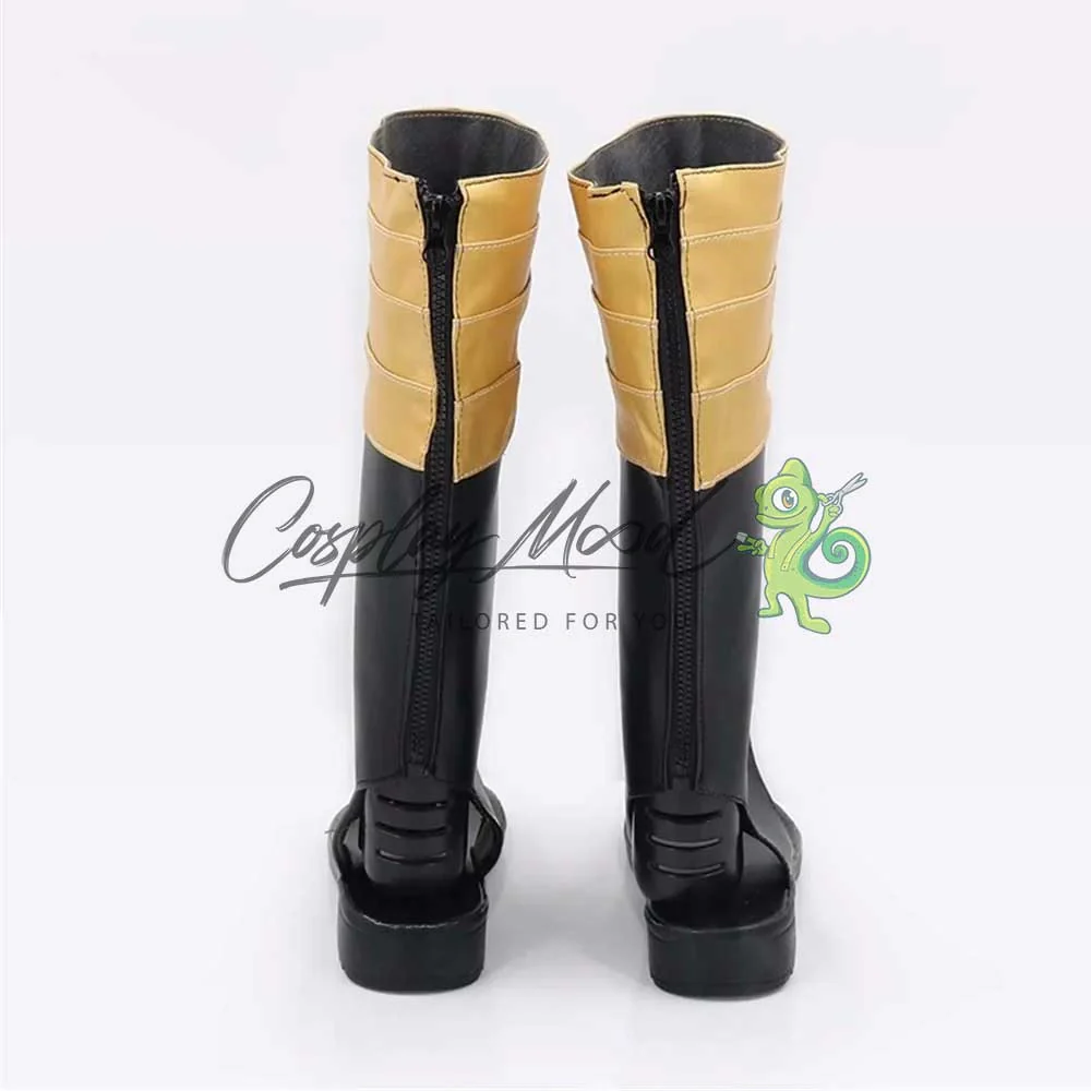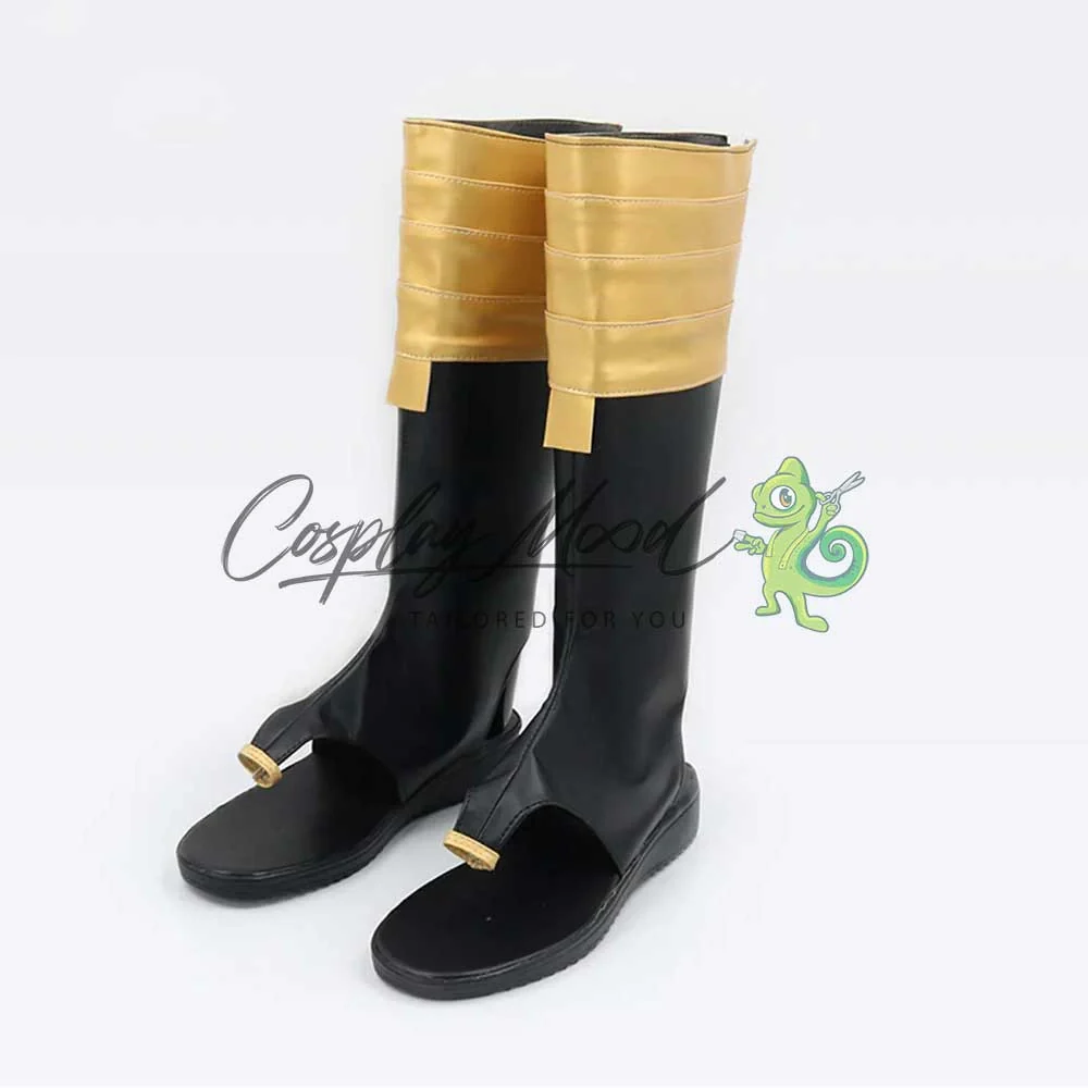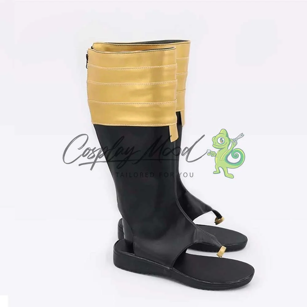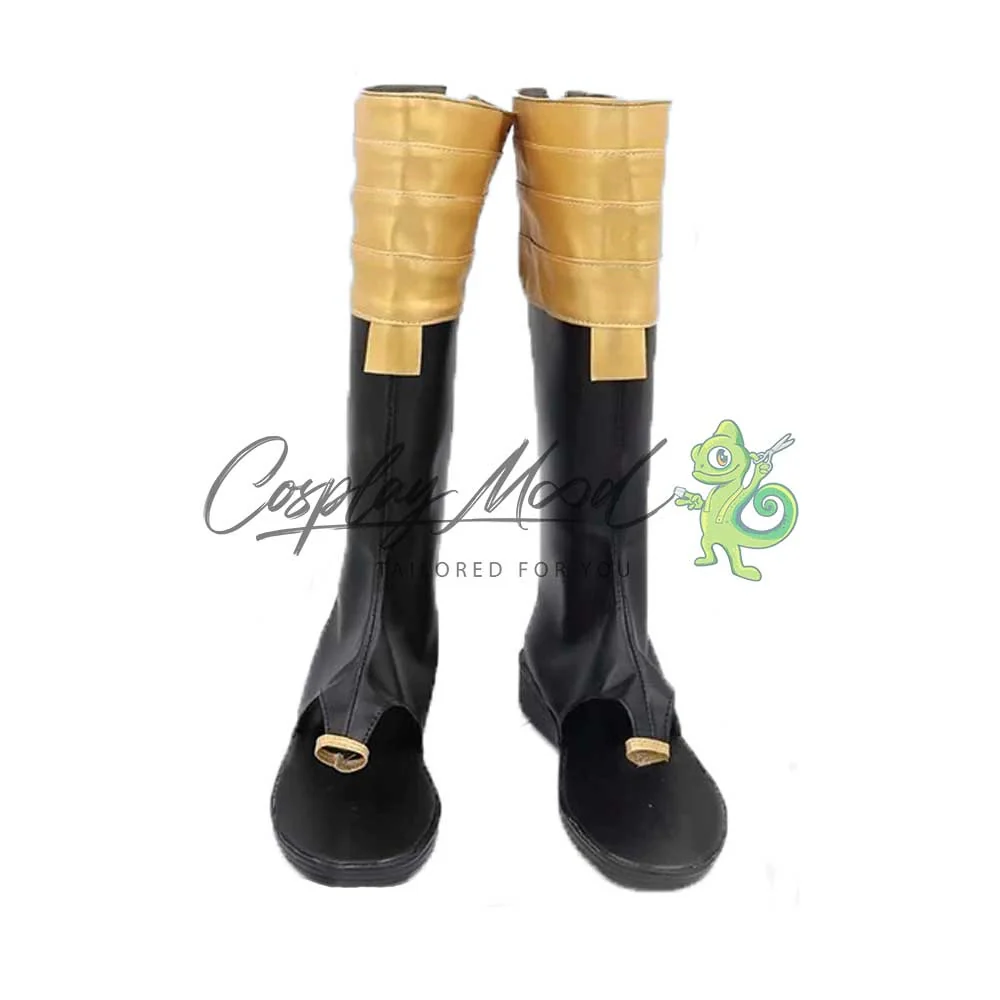 Gli stivali sono realizzati in pelle PU e lavorati con dettagli tipici del personaggio in questione. Questo tipo di calzature sono resistenti ad urti e strappi ed appariranno come da immagine: un paio di stivali lunghi neri con quattro cerchi dorati posti nella parte alta e una piccola finitura sempre color oro alla fine del blocco. La parte delle dita rimane scoperta, fissandosi all’alluce con una decorazione simile ad un anello sempre color oro. Gli stivali cosplay sono fatti su ordinazione, quando il laboratorio finisce di realizzarli verranno spediti immediatamente. Potrebbe accadere che alcuni tipi di scarpe o stivali all’inizio possano avere un forte odore che per alcune persone potrebbe risultare sgradevole. Questa cosa si risolverà facilmente mettendo le scarpe o gli stivali in un luogo areato per qualche giorno.