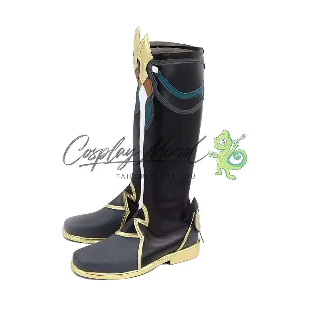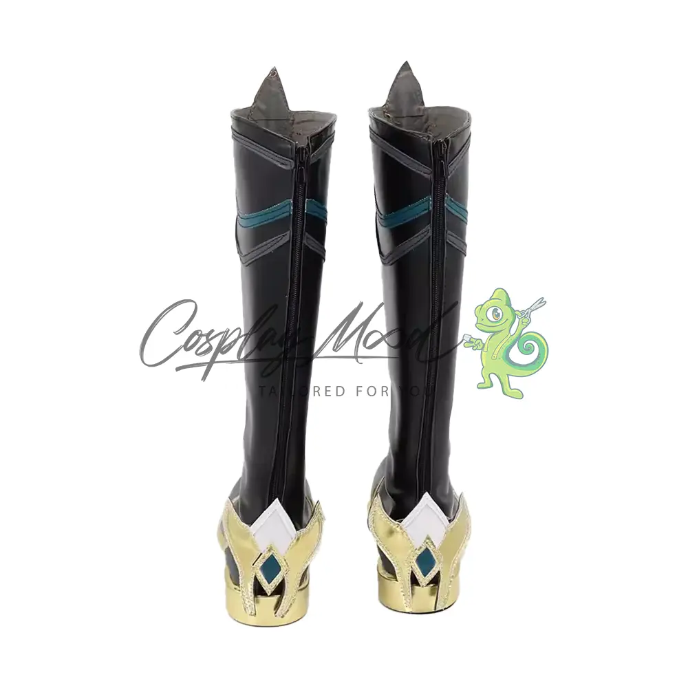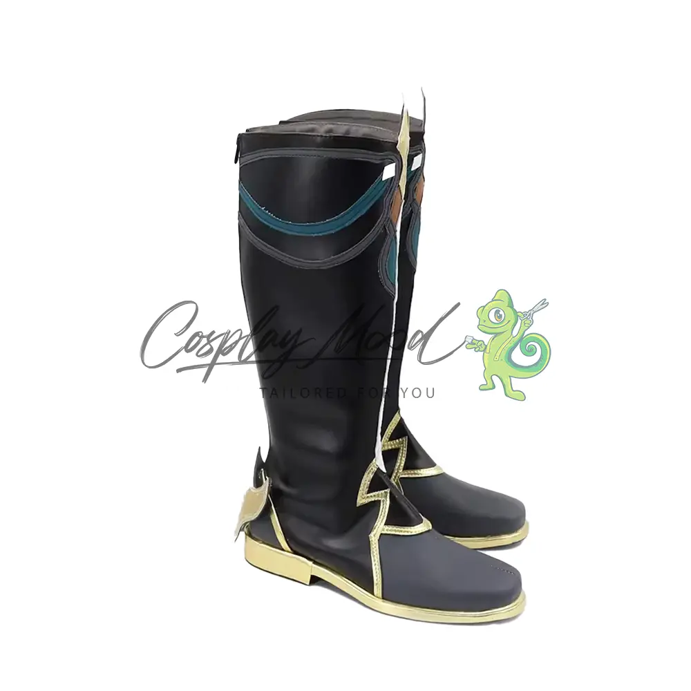 Questi stivali cosplay sono realizzati in pelle PU e lavorati con dettagli tipici del personaggio in questione. Questo tipo di calzature sono resistenti ad urti e strappi ed appariranno come da immagine: un paio di stivali lunghi in prevalenza neri, con la punta grigio freddo e decorazioni dorate che corrono lungo la suola, il tacco e sul fronte della calzatura. Nella parte alta si trovano delle finiture di tipo geometrico di colore marrone, verde e bianco, al centro è posta una linguetta dorata alta e una lunga striscia bianca che percorre tutto il fronte degli stivali. Sul retro infine, è possibile vedere la decorazione dorata, bianca e verde del tallone e il proseguimento del disegno centrale.