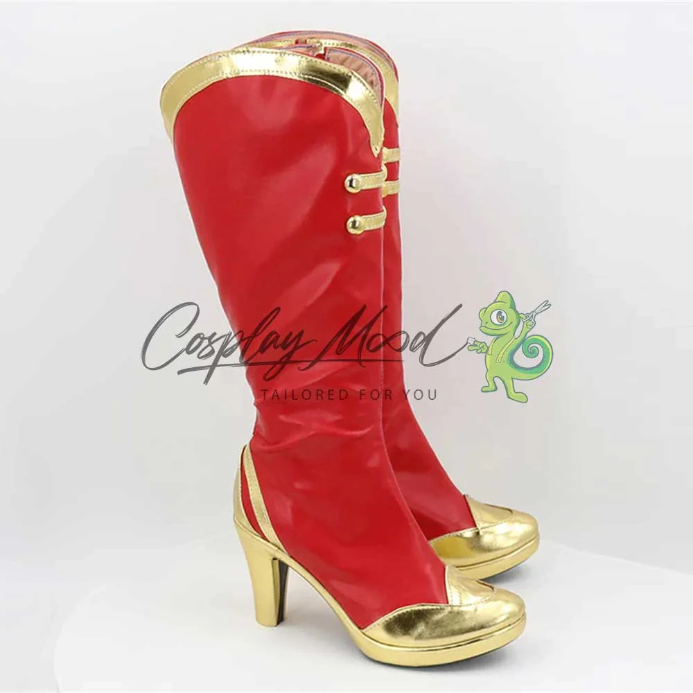 Gli stivali sono realizzati in pelle PU, un materiale bello esteticamente e molto resistente e come puoi vedere dalle immagini questi si compongono di: una base rossa con decorazioni dorate che corrono lungo la parte superiore e dalla punta al tallone passando per suola e tacco. In alto si trovano anche due piccole finiture sempre di color oro che ricordano delle cinghie. Davvero un paio di stivali cosplay particolare ed inusuale rispetto agli stivali che siamo abituati ad utilizzare tutti i giorni.