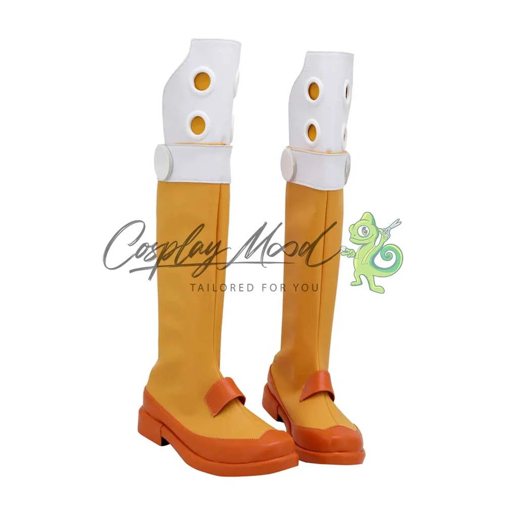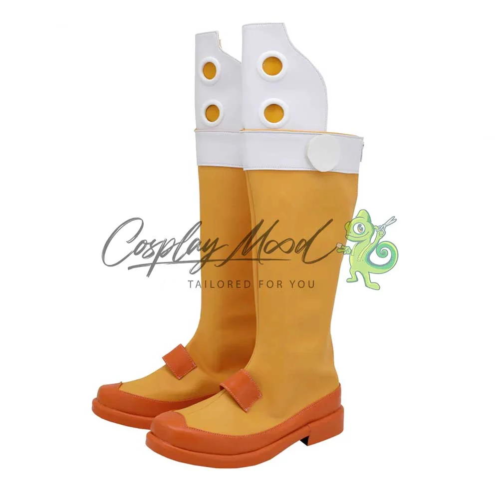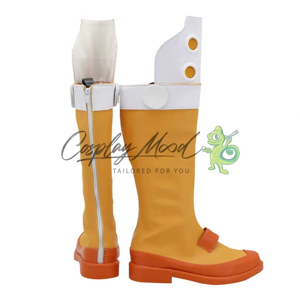 Gli stivali sono realizzati in pelle PU e lavorati con dettagli tipici del personaggio in questione. Questo tipo di calzature sono resistenti ad urti e strappi ed appariranno come da immagine: un paio di stivali prevalentemente arancione chiaro con decorazioni di color arancio scuro su suola e tacchetti, lo stesso colore si trova anche nella parte immediatamente superiore e funge da contorno dalla punta fino al tallone. Sopra è posta una decorazione dello stesso colore e nella parte alta è ben visibile una striscia bianca con finiture tondeggianti del medesimo colore, poste sui lati. Al di sopra una parte sempre di color bianco, rifinita con buchi arancioni bordati di bianco. Gli stivali cosplay sono fatti su ordinazione, quando il laboratorio finisce di realizzarli verranno spediti immediatamente. Potrebbe accadere che alcuni tipi di scarpe o stivali all’inizio possano avere un forte odore che per alcune persone potrebbe risultare sgradevole. L’inconveniente si risolverà facilmente mettendo le scarpe o gli stivali in un luogo areato per una sera o al massimo qualche giorno.