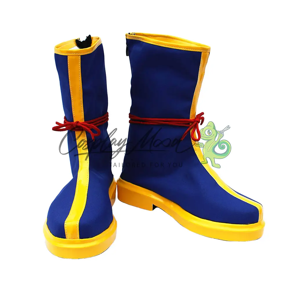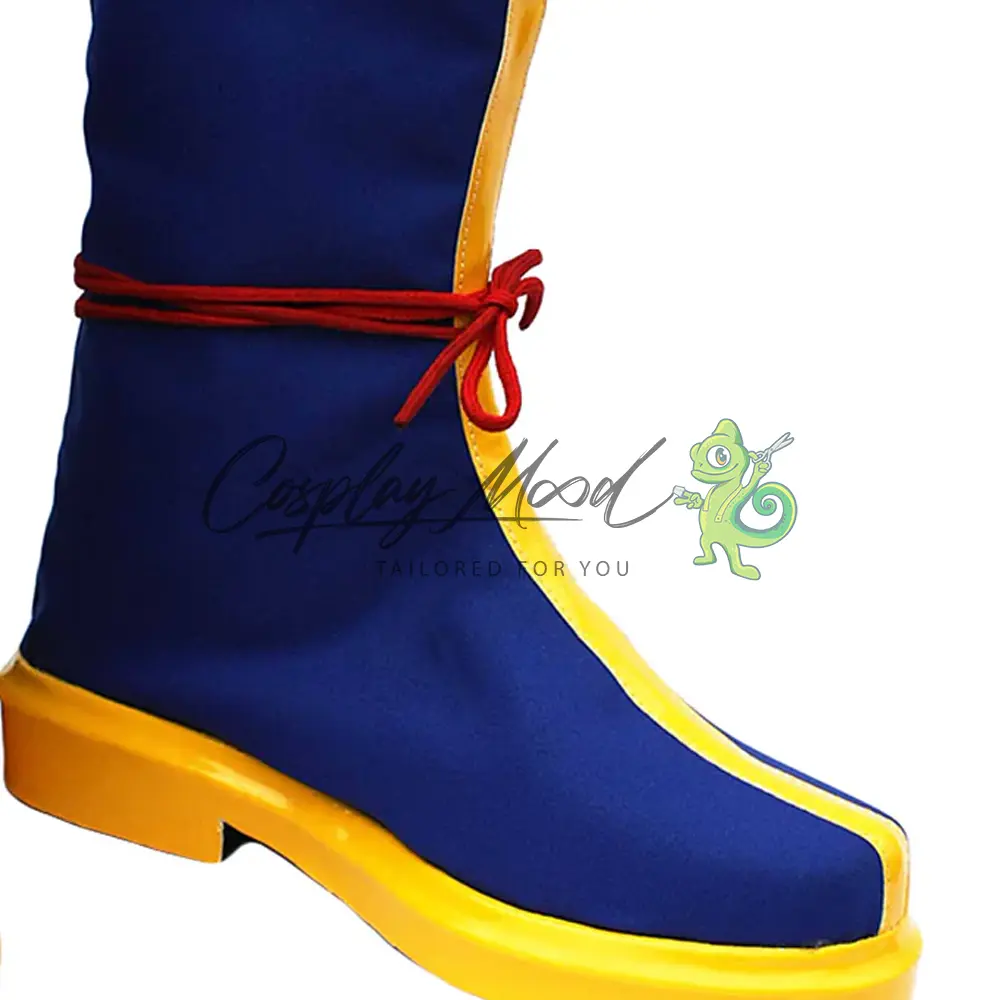 Questi stivali cosplay sono realizzati in eco pelle e lavorati con dettagli tipici del personaggio in questione. Questo tipo di calzature sono resistenti ad urti e strappi ed appariranno come da immagine: un paio di stivali blu con bordi e suola gialli e cordicella rossa a metà calzatura.