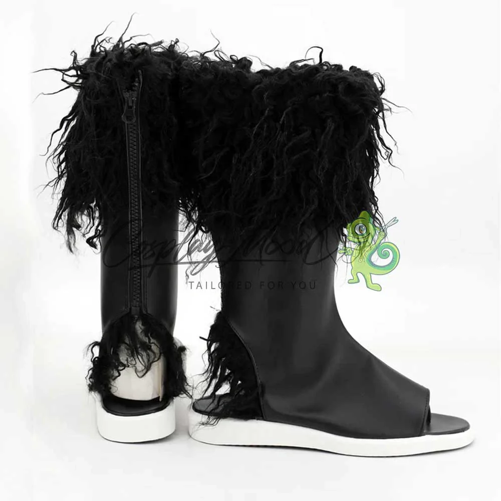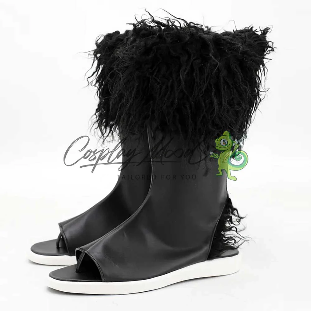 Gli stivali sono realizzati in pelle PU e lavorati con dettagli tipici del personaggio in questione. Questo tipo di calzature sono resistenti ad urti e strappi ed appariranno come da immagine: un paio di stivali lunghi neri aperti frontalmente e posteriormente con annesso peloncino dello stesso colore. Nella parte alta è posto un risvolto sempre di peloncino. Le nostre calzature cosplay sono fatte su ordinazione, quando il laboratorio finisce di realizzarle verranno spedite immediatamente. Potrebbe accadere che alcuni tipi di scarpe o stivali all’inizio possano avere un forte odore che per alcune persone potrebbe risultare alquanto sgradevole. Questa cosa si risolverà facilmente mettendo le scarpe o gli stivali in un luogo areato per una notte o al massimo per qualche giorno.