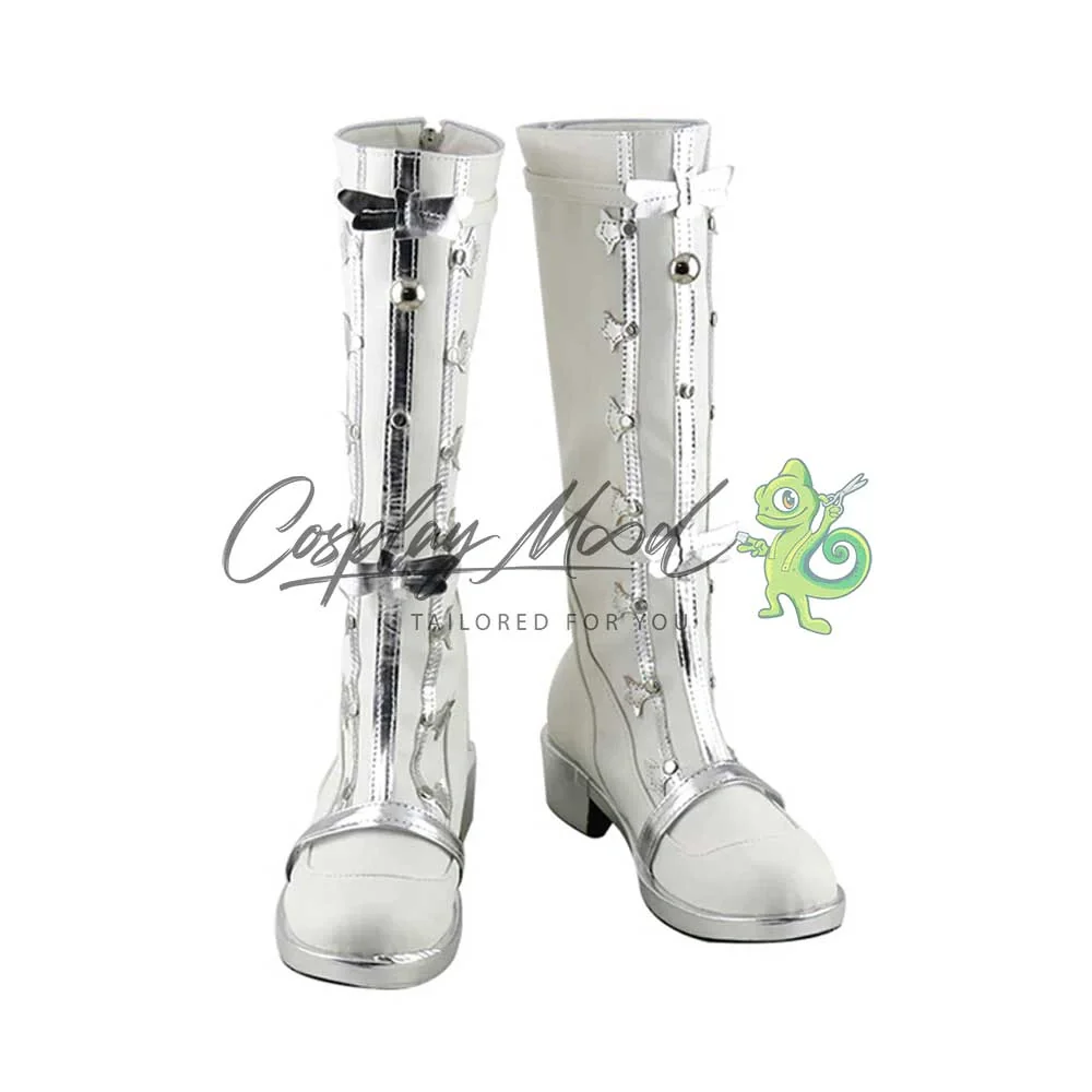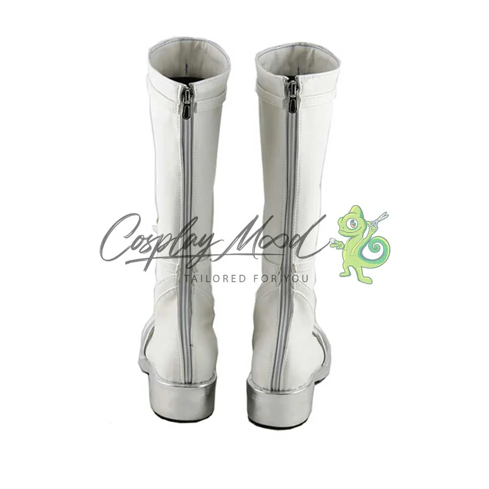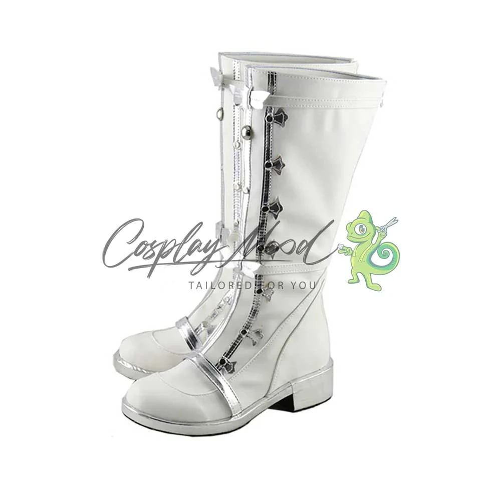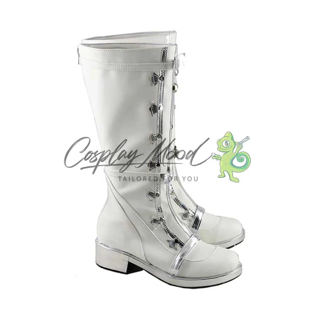 Gli stivali sono realizzati in pelle PU e lavorati con dettagli tipici del personaggio in questione. Questo tipo di calzature sono resistenti ad urti e strappi ed appariranno come da immagine: un paio di lunghi stivali bianchi con tacco e suola color argento brillante. Sul fronte si può notare una piccola fascia sempre argentata, una lunga striscia centrale ed altre due parallele con varie decorazioni ai margini, che riprendono degli elaborati lacci antichi, sono inoltre visibili delle perline centrali di media e piccola grandezza. In alto è posta una striscia color bianco che viene ripresa anche all’altezza dell’inizio dello stinco, corredata da fiocchi argentati in ambo i punti. Completano delle rifiniture bianche nella parte inferiore. Gli stivali cosplay sono realizzati su ordinazione, quando il laboratorio finisce di produrli verranno spediti immediatamente al destinatario. All’inizio, potrebbe accadere che alcuni tipi di scarpe o stivali possano emanare un forte odore che per alcune persone potrebbe risultare sgradevole. L’inconveniente si risolverà facilmente mettendo le scarpe o gli stivali in un luogo areato per una sera o al massimo qualche giorno.