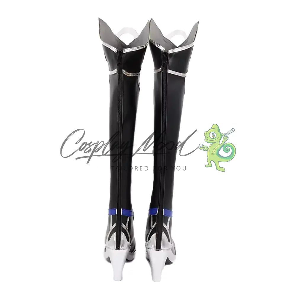 Questi stivali cosplay sono realizzati in pelle PU e lavorati con dettagli tipici del personaggio in questione. Questo tipo di calzature sono resistenti ad urti e strappi ed appariranno come da immagine: un paio di stivali lunghi in prevalenza neri, con suola e tacco color argento. Sul fronte e lungo i lati sono presenti delle decorazioni geometriche argentate e di colore blu. Nella parte alta si trovano due finiture trasparenti.