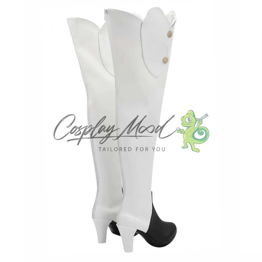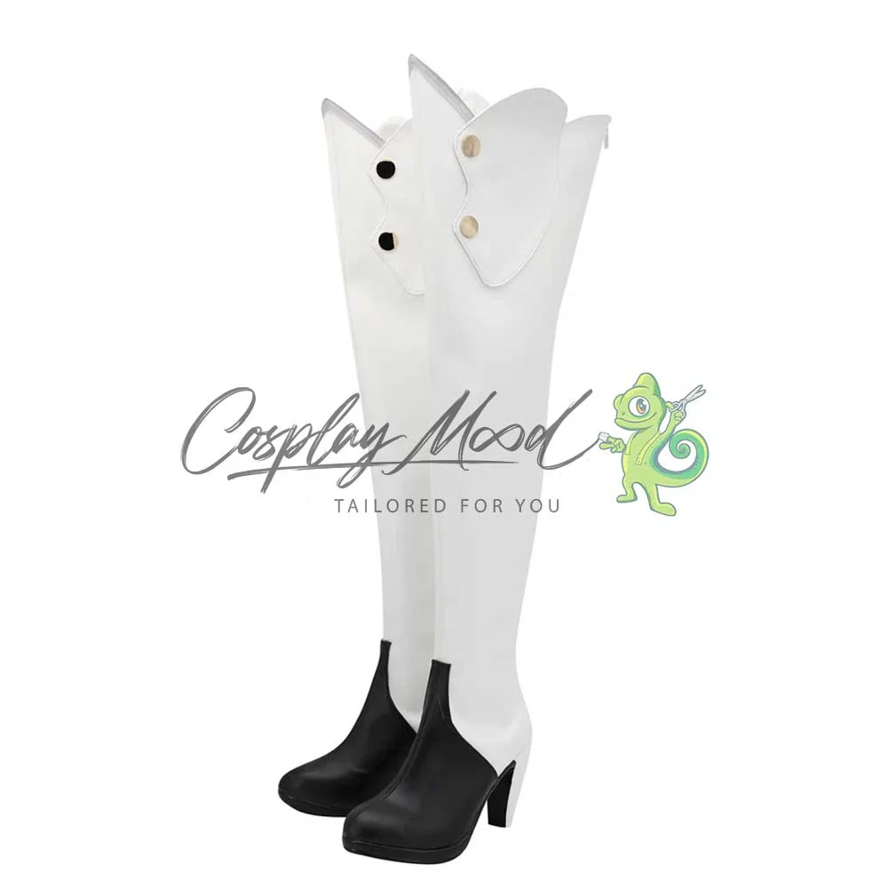 Gli stivali sono realizzati in pelle PU e lavorati con dettagli tipici del personaggio in questione. Questo tipo di calzature sono resistenti ad urti e strappi ed appariranno come da immagine: un paio di lunghi stivali bianchi con decorazioni a forma di fiore nella parte alta e bottoncini dorati che completano la figura.