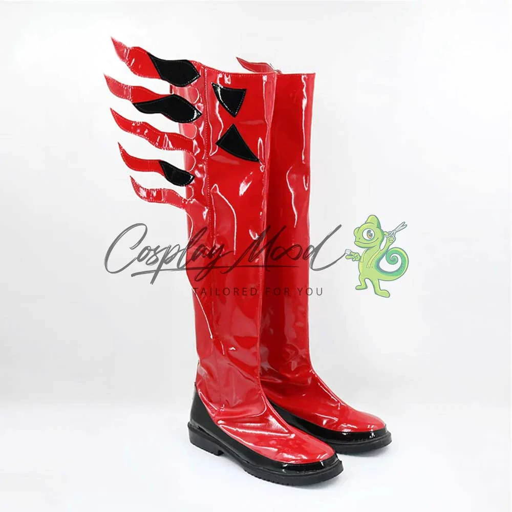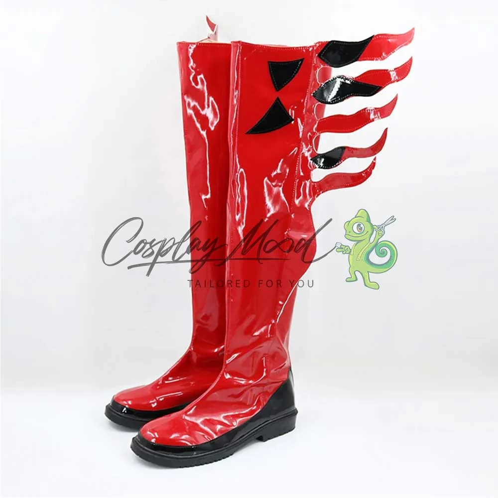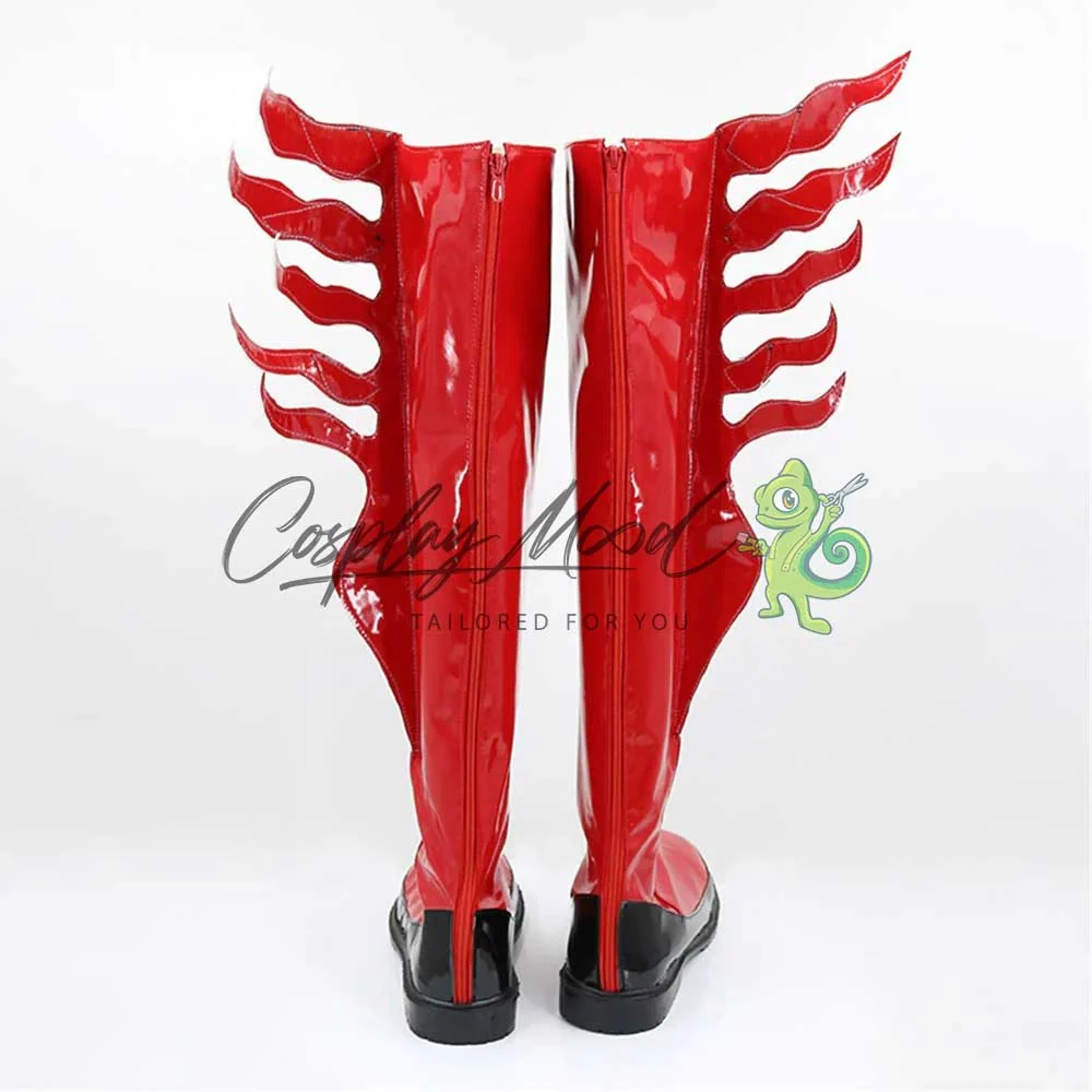 Tutte le nostre calzature sono realizzate in pelle PU e lavorate con dettagli tipici del personaggio in questione. Questo materiale le rende resistenti ad urti e strappi ed appariranno come da immagine: un paio di lunghi stivali lucidi rosso fuoco. La zona centrale risulta larga, per meglio riprendere il design originale del personaggio. In alto ci sono delle decorazioni rosse e nere simili a fiamme e altre di colore nero e forma triangolare sono poste sul lato.