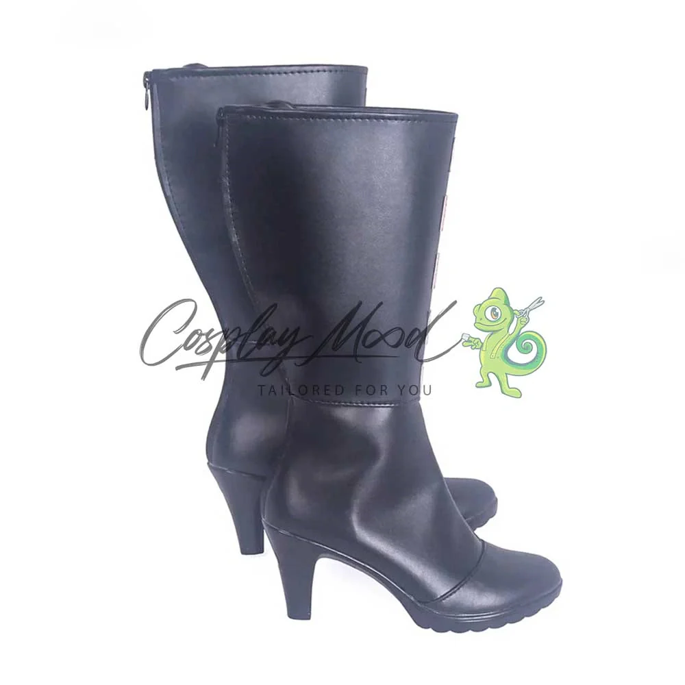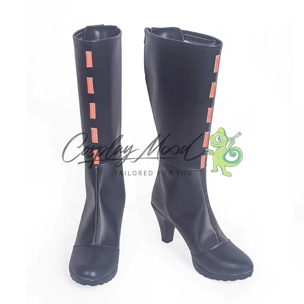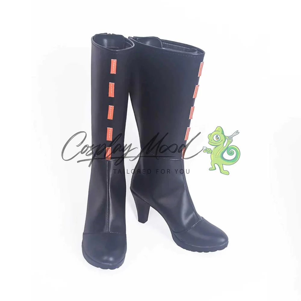 Gli stivali sono realizzati in pelle PU e lavorati con dettagli tipici del personaggio in questione. Questo tipo di calzature sono resistenti ad urti e strappi ed appariranno come da immagine: un paio di stivali neri con il tacco e una serie di cinque segmenti arancioni sul fronte per gamba.