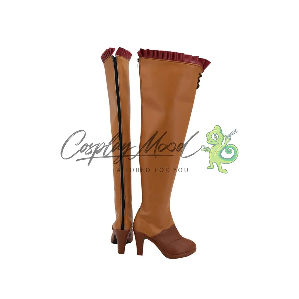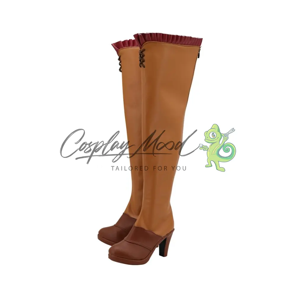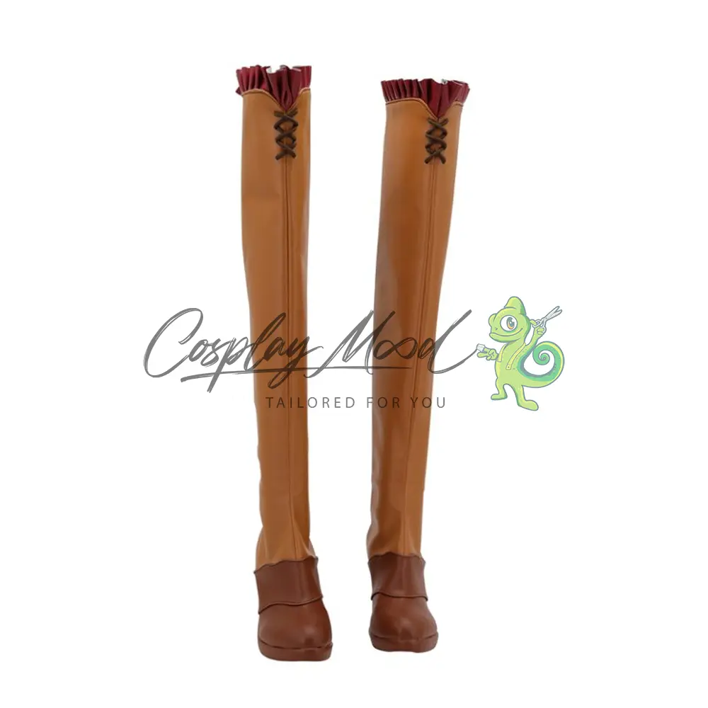 Le scarpe sono realizzate in pelle PU e lavorate con dettagli tipici del personaggio in questione. Questo tipo di calzature sono resistenti ad urti e strappi ed appariranno come da immagine: un paio di stivali lunghi marrone cammello con lacci incrociati nella parte alta e tessuto rosso increspato sul margine superiore. La zona del piede è marrone scuro con tacco, completa una lunga cerniera posteriore. Gli stivali cosplay sono fatti su ordinazione, quando il laboratorio finisce di realizzarli verranno spediti immediatamente. Potrebbe accadere che alcuni tipi di scarpe o stivali all’inizio possano avere un forte odore che per alcune persone potrebbe risultare sgradevole. Questa cosa si risolverà facilmente mettendo le scarpe o gli stivali in un luogo areato per qualche giorno.