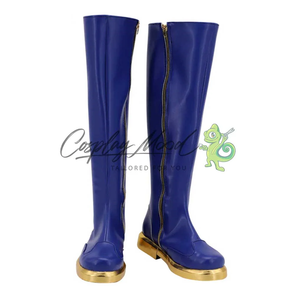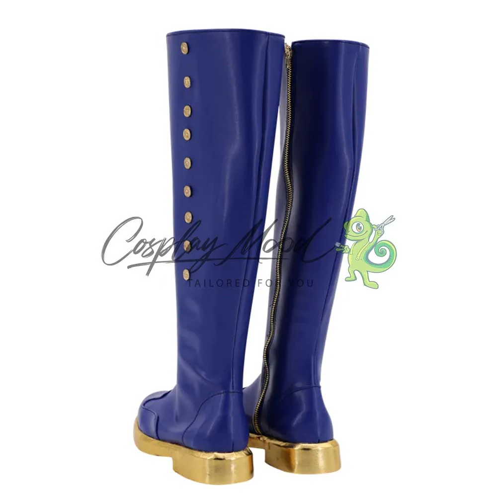 Gli stivali sono realizzati in pelle PU e lavorati con dettagli tipici del personaggio in questione. Questo tipo di calzature sono resistenti ad urti e strappi ed appariranno come da immagine: un paio di lunghi stivali blu, corredati da file di bottoni laterali e suola dorata.
