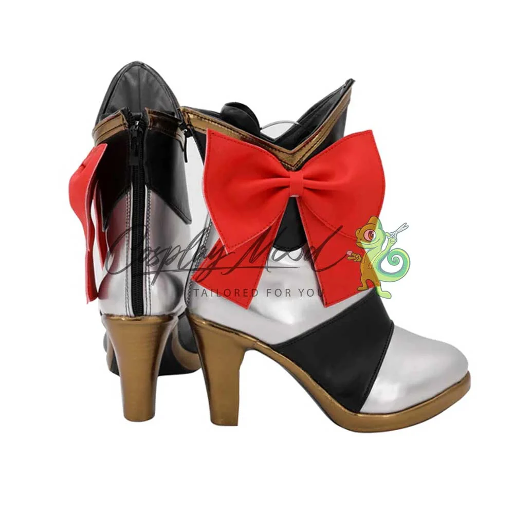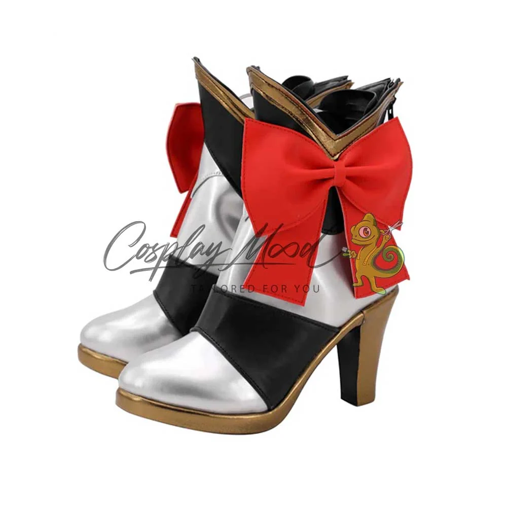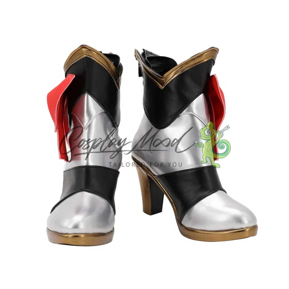 Gli stivali sono realizzati in pelle PU e lavorati con dettagli tipici del personaggio in questione. Questo tipo di calzature sono resistenti ad urti e strappi ed appariranno come da immagine: un paio di stivaletti argentati e neri con suola, tacco ed apice dorati. Sui lati sono posti due grandi fiocchi rossi.