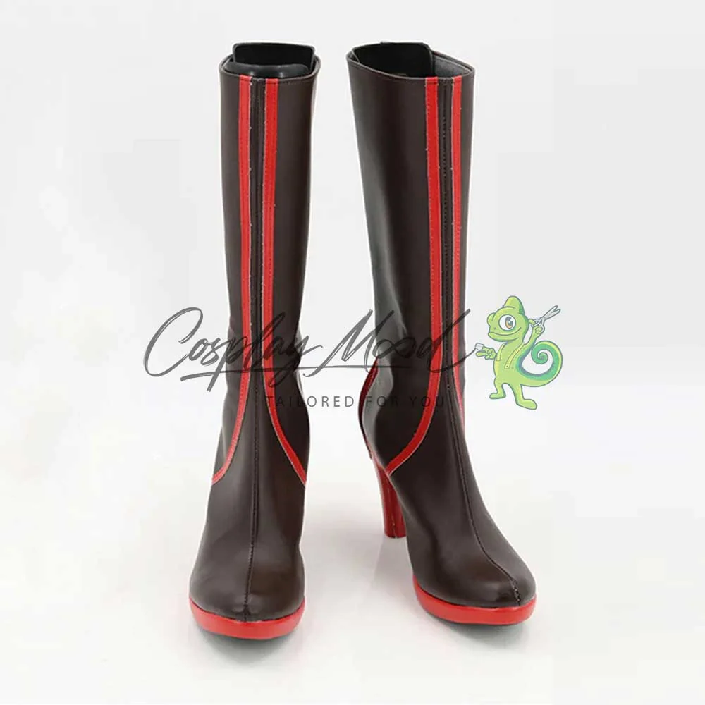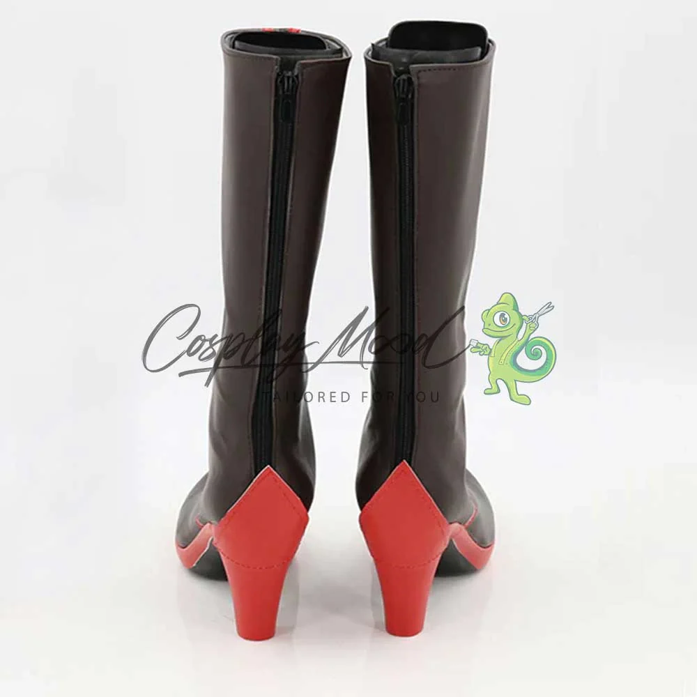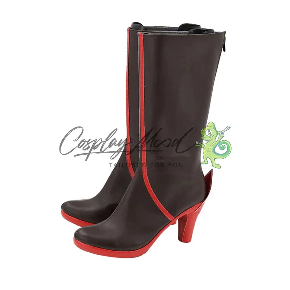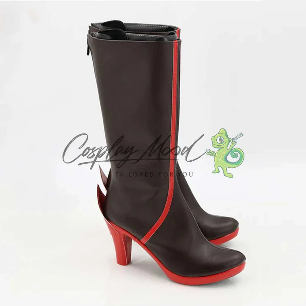 Le scarpe sono realizzate in pelle PU e lavorate con dettagli tipici del personaggio in questione. Questo tipo di calzature sono resistenti ad urti e strappi ed appariranno come da immagine: un paio di stivali neri con decorazioni rosse sulla parte frontale, anche la suola ed il tacco sono bordati di rosso e quest’ultimo finisce in due piccole punte sul retro.