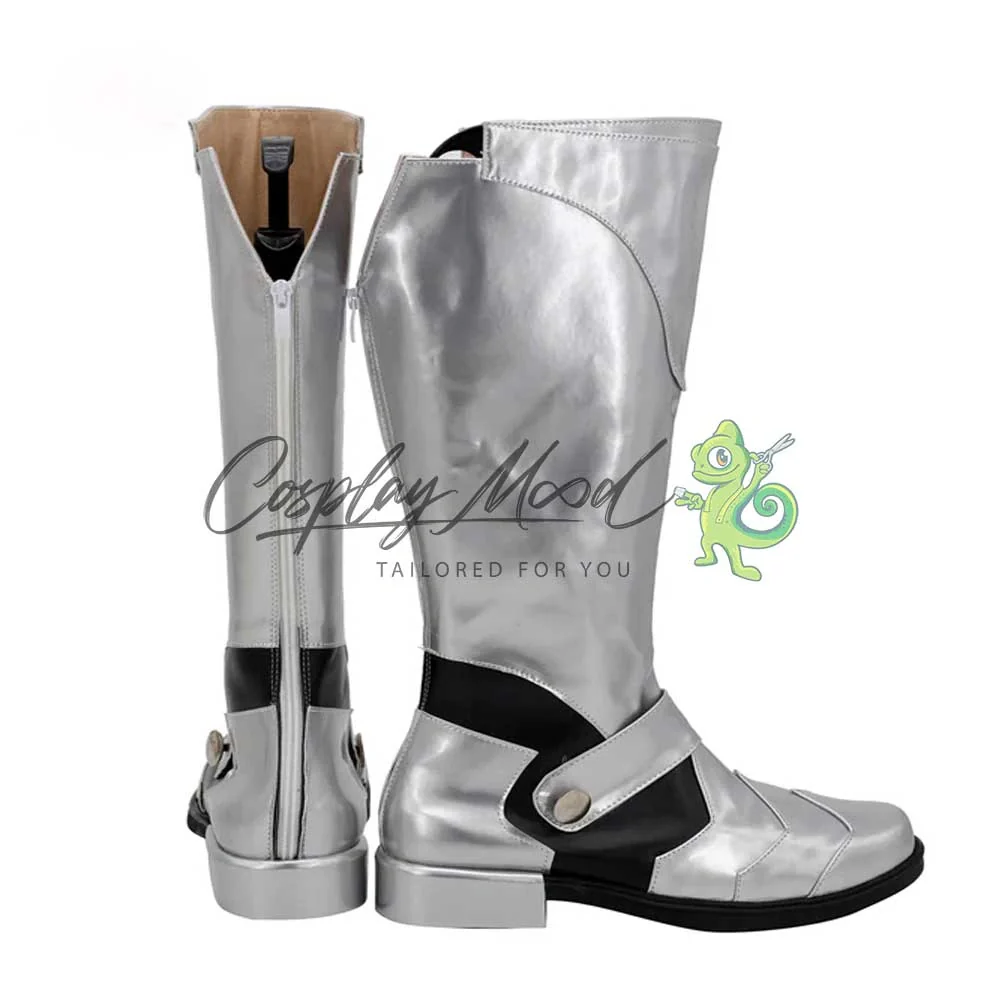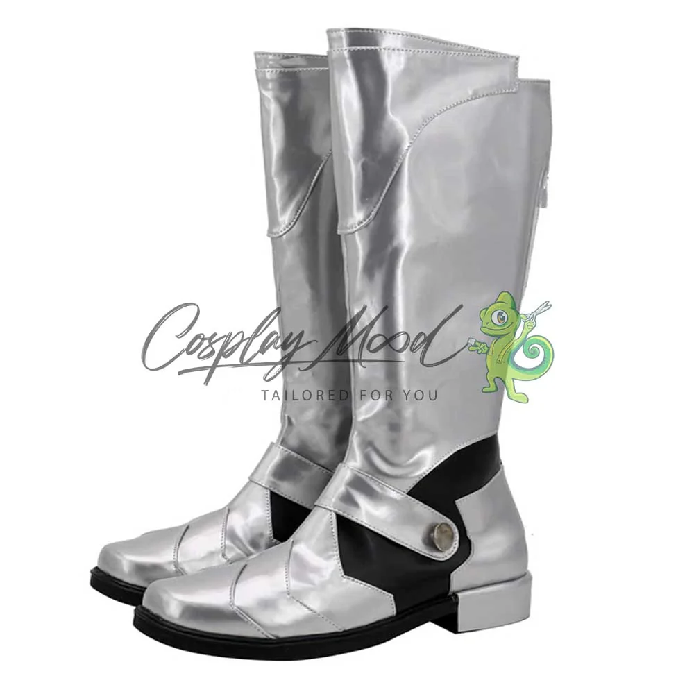 Gli stvali sono realizzati in pelle PU e lavorati con dettagli tipici del personaggio in questione. Questo tipo di calzature sono resistenti ad urti e strappi ed appariranno come da immagine: un paio di stivali argentati con decorazioni nere nella parte inferiore ed una cinghietta davanti sempre color argento.
