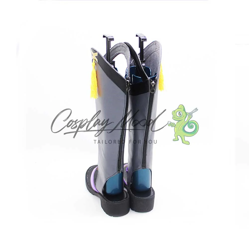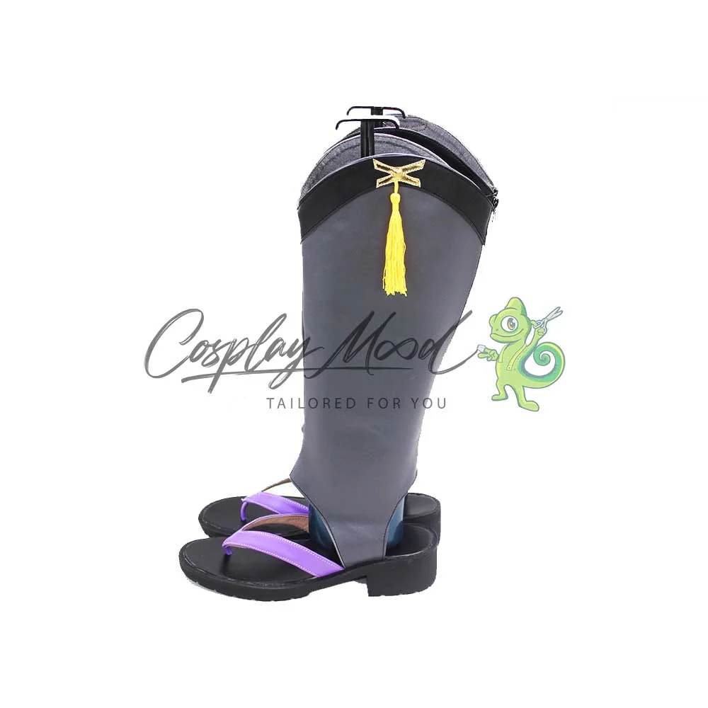 Gli stivali sono realizzati in pelle PU e lavorati con dettagli tipici del personaggio in questione. Questo tipo di calzature sono resistenti ad urti e strappi ed appariranno come da immagine: una base stile ciabattina nera con infradito color lilla aperta sul retro, la zona superiore si compone di una sezione lunga grigio scuro che termina con una banda nera e un’altra posta poco sopra. Completano due nappette gialle ai lati delle calzature.