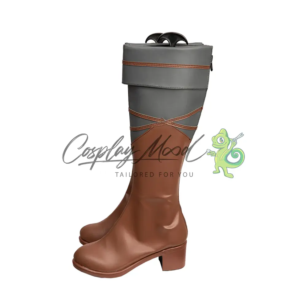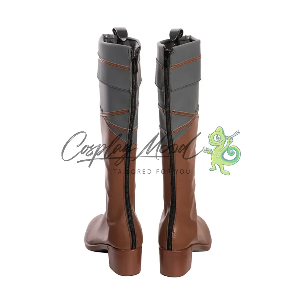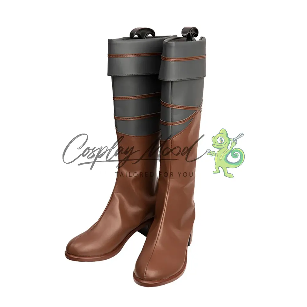 Questi stivali sono realizzati in pelle PU e lavorati con dettagli tipici del personaggio in questione. Questo tipo di calzature sono resistenti ad urti e strappi ed appariranno come da immagine: un paio di stivali lunghi marroni con il tacco. La parte alta è ripiegata e di colore grigio, così come quella sottostante che comprende anche delle righe marroni decorative.