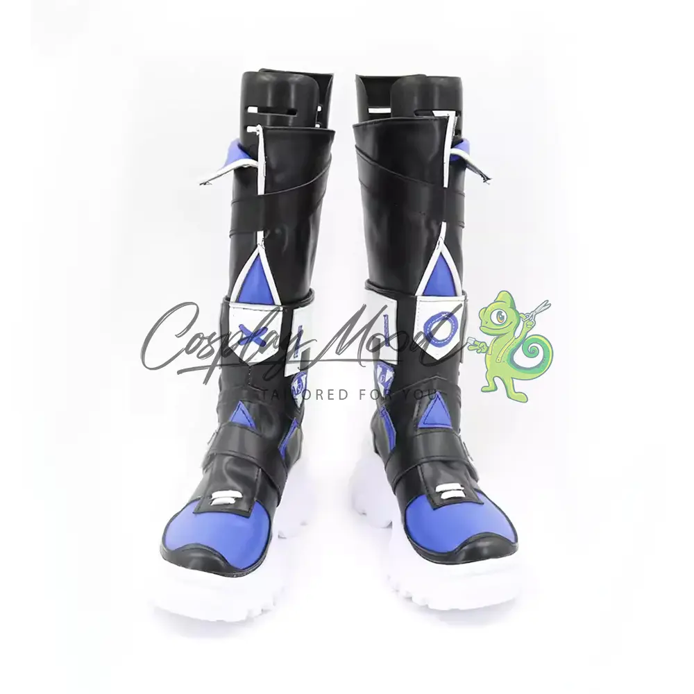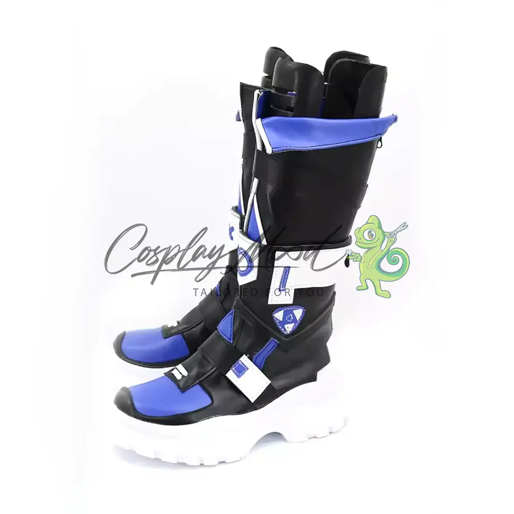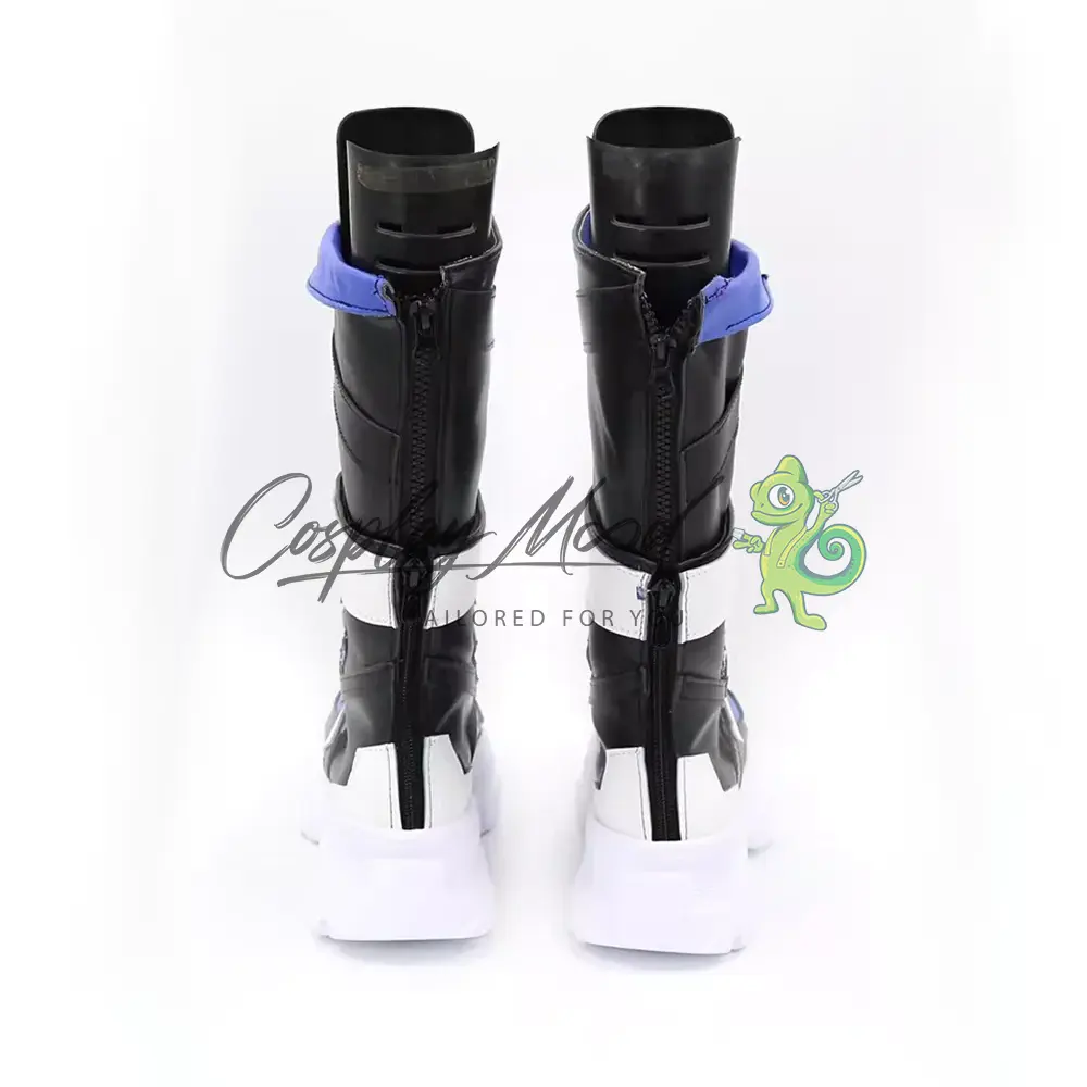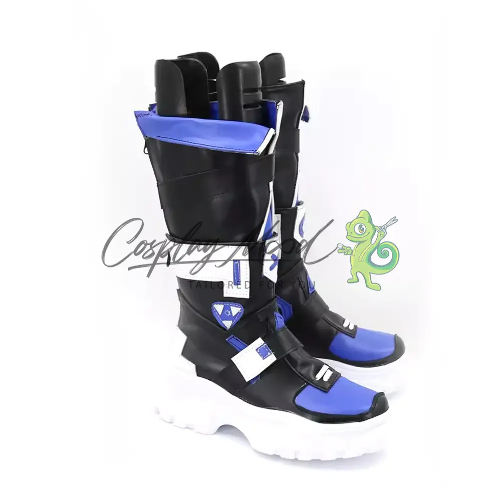 Questi stivali cosplay sono realizzati in pelle PU e lavorati con dettagli tipici del personaggio in questione. Questo tipo di calzature sono resistenti ad urti e strappi ed appariranno come da immagine: un paio di stivali lunghi in prevalenza neri, con suola rialzata di colore bianco, decorazioni frontali blu e bianche posizionate sia sulla zona delle dita che nel corpo dello stivale. Le linguette centrali si differenziano l’una dall’altra per un cerchio o una x. Nella parte dietro sono poste due cinghie bianche e all’apice degli stivali si trovano due linguette blu con bordi bianchi sporgenti. Completano rifiniture nere in rilievo su tutta la calzatura.