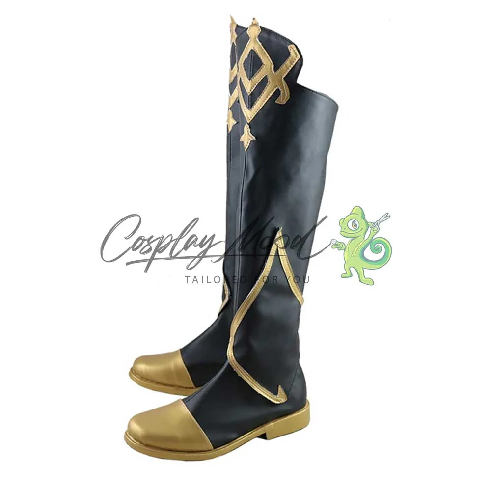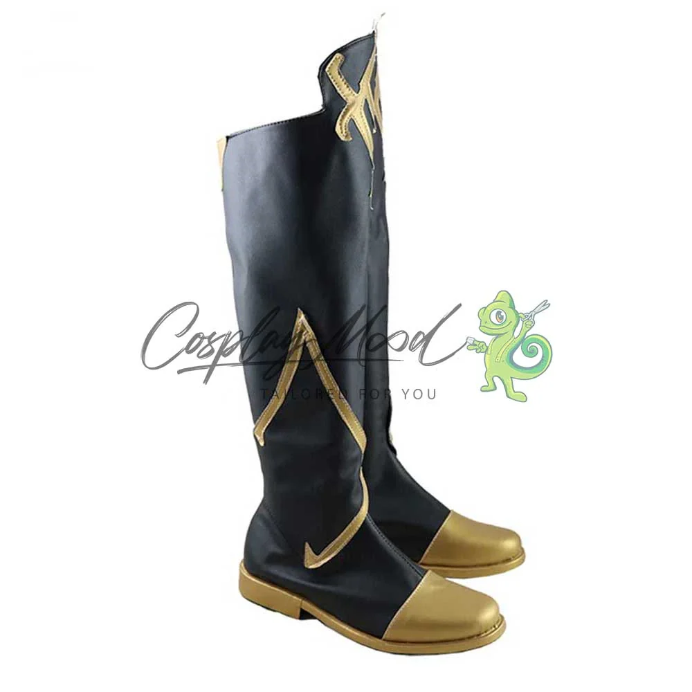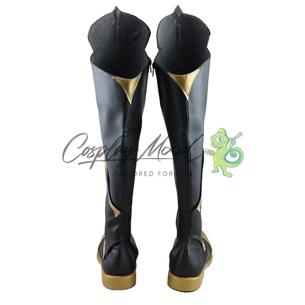 Gli stivali sono realizzati in pelle PU e lavorati con dettagli tipici del personaggio in questione. Questo tipo di calzature sono resistenti ad urti e strappi ed appariranno come da immagine: un paio di stivali lunghi neri con decorazioni dorate che corrono lungo gli stinchi e diventano più elaborate nella parte adiacente alle ginocchia. Dietro troverete un’altra decorazione dorata ed anche le punte saranno foderate del medesimo colore.