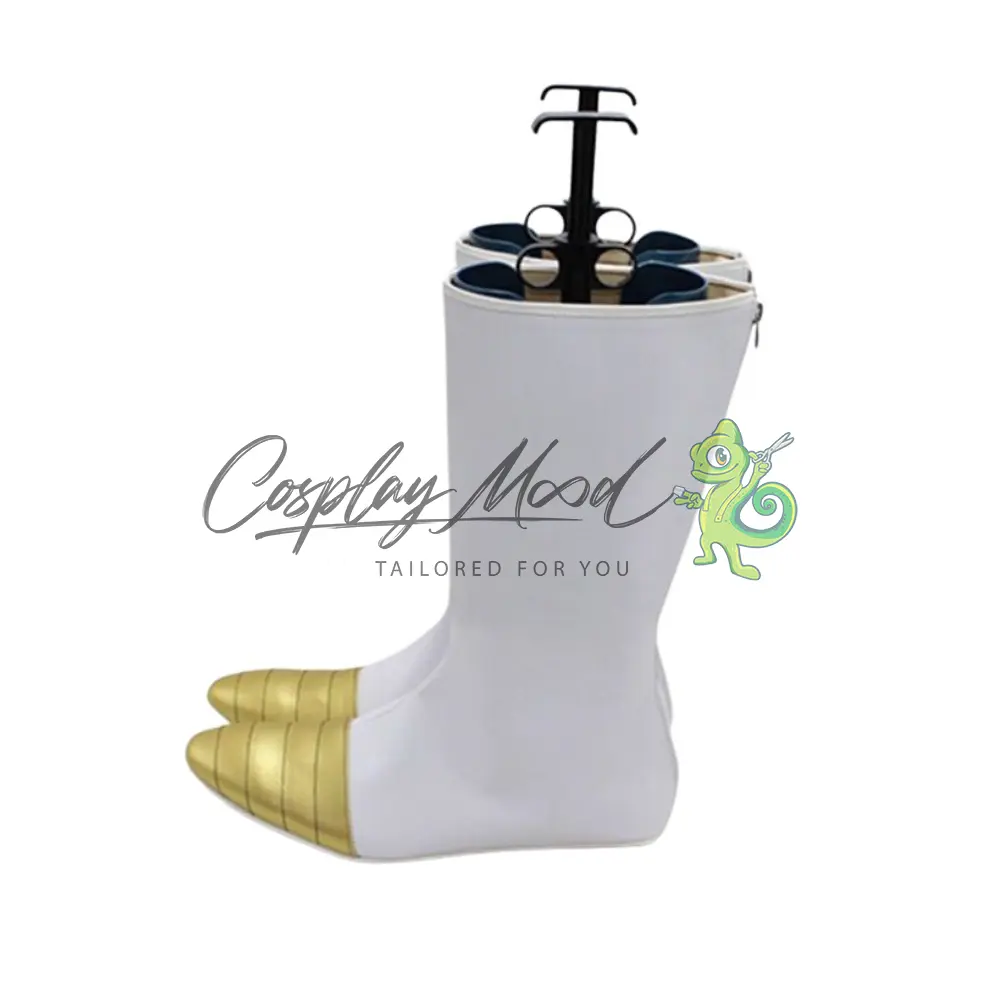 Questi stivali cosplay sono realizzati in eco pelle e lavorati con dettagli tipici del personaggio in questione. Questo tipo di calzature sono resistenti ad urti e strappi ed appariranno come da immagine: un paio di stivali bianchi con punta dorata a righe.