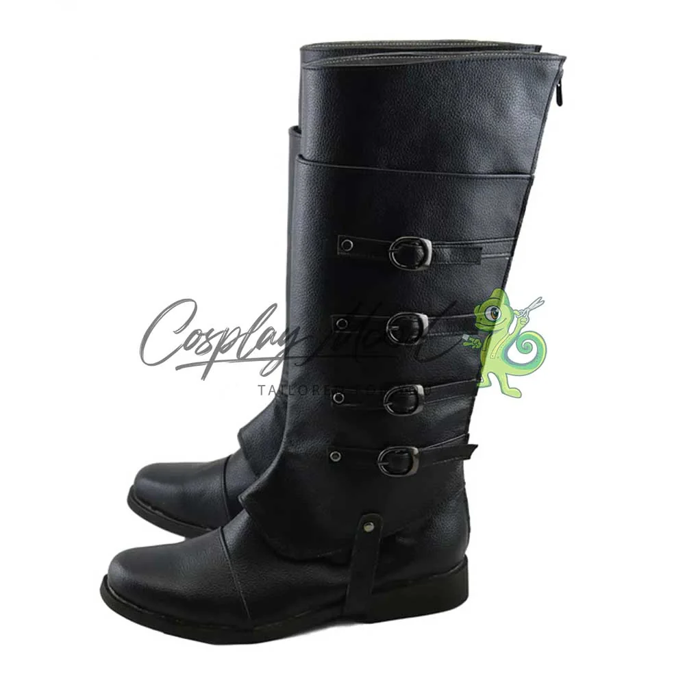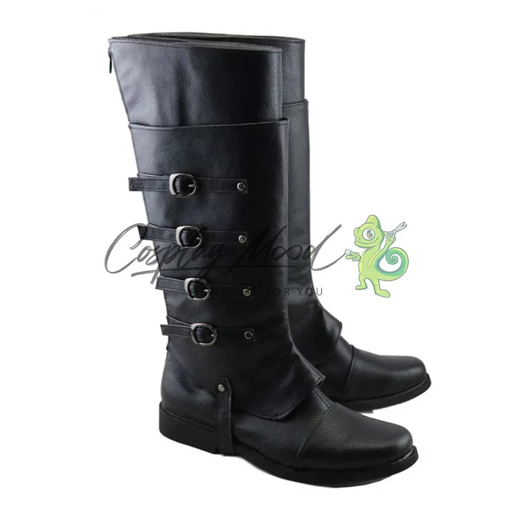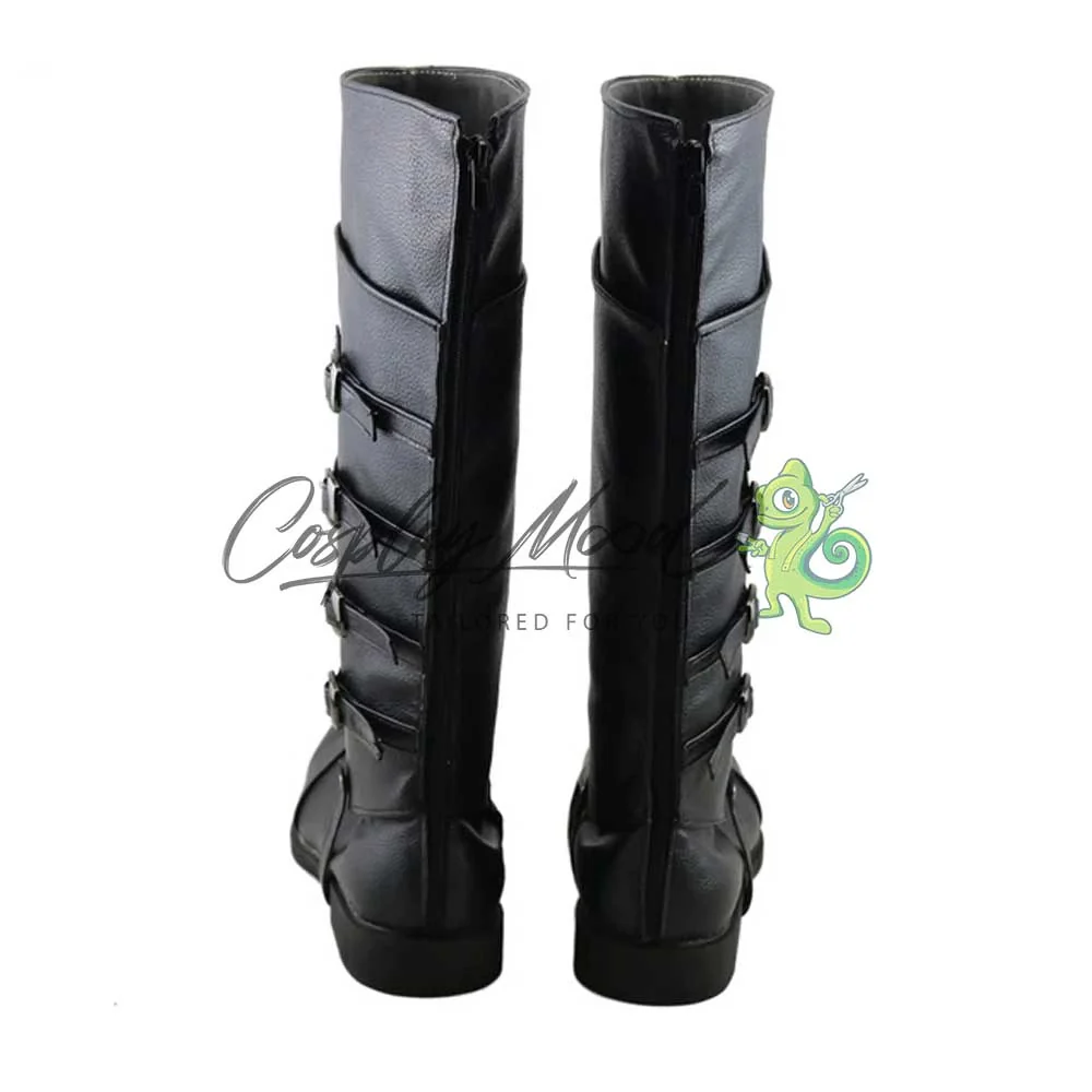 Come è possibile vedere dalle immagini, gli stivali sono realizzati in pelle PU e lavorati con dettagli tipici del personaggio in questione. Questo tipo di calzature sono resistenti ad urti e strappi ed appariranno come da immagine: un paio di stivali lunghi neri con un sovra stivale dotato di quattro cinghie laterali e una nella parte bassa che si ferma sotto il tacchetto.