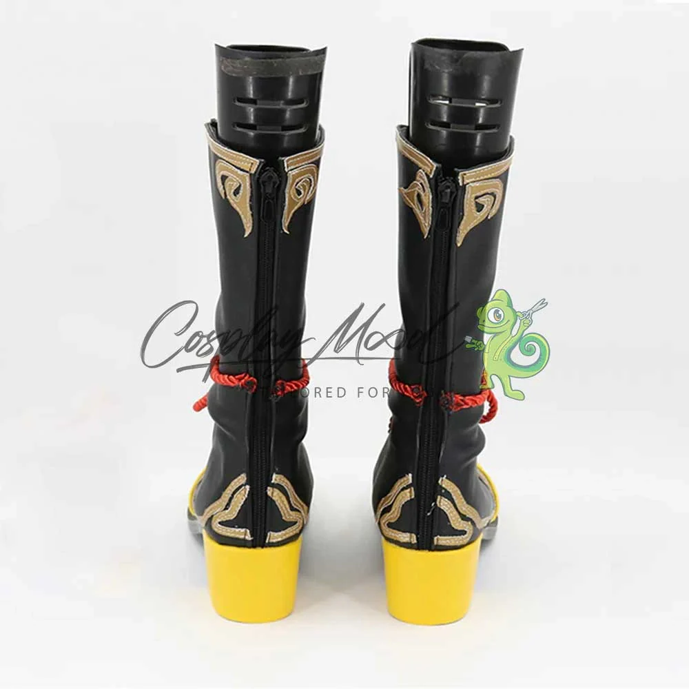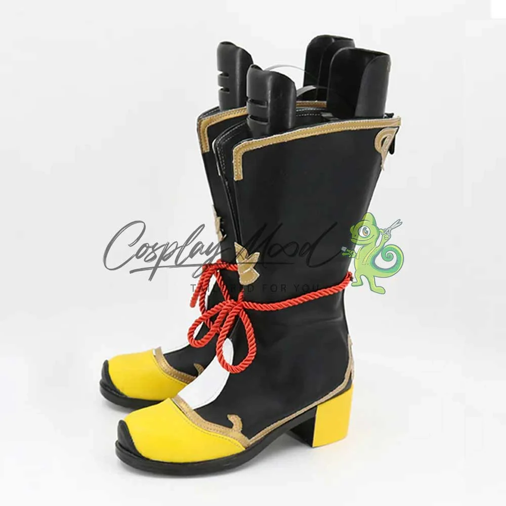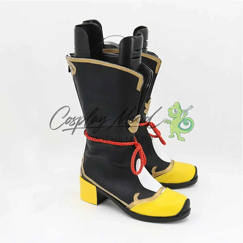 Gli stivali sono realizzati in pelle PU e lavorati con dettagli tipici del personaggio in questione. Questo tipo di calzature sono resistenti ad urti e strappi ed appariranno come da immagine: Un paio di stivali neri con un’apertura frontale, seguita da decorazioni bianche e dorate che richiamano vari simboli orientali sul fronte e sul retro. Davanti la punta è rivestita di giallo, così come i tacchi e all’altezza della caviglia è posto su entrambi gli stivali un fiocco di corda rossa.