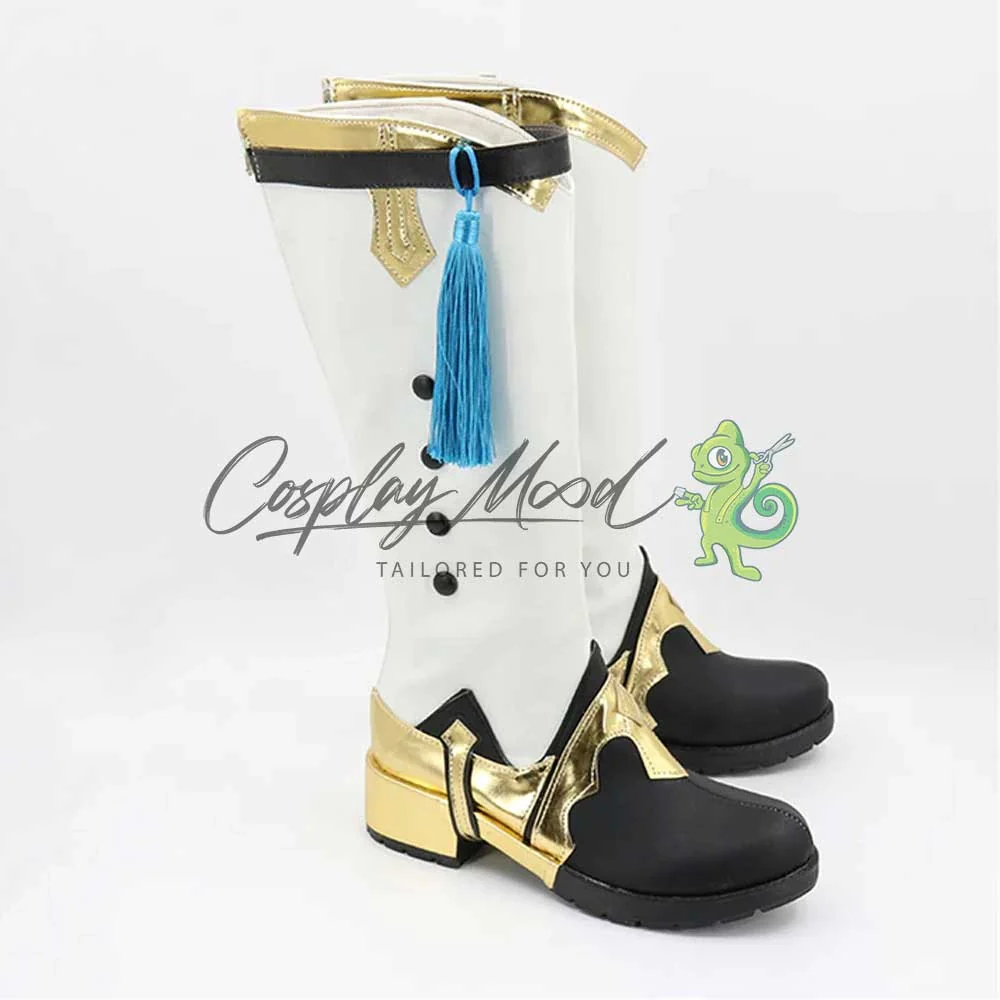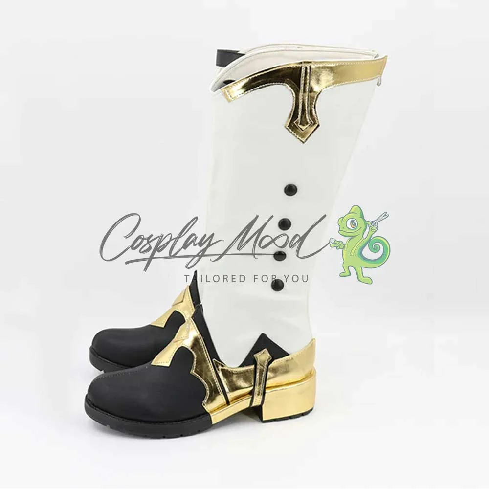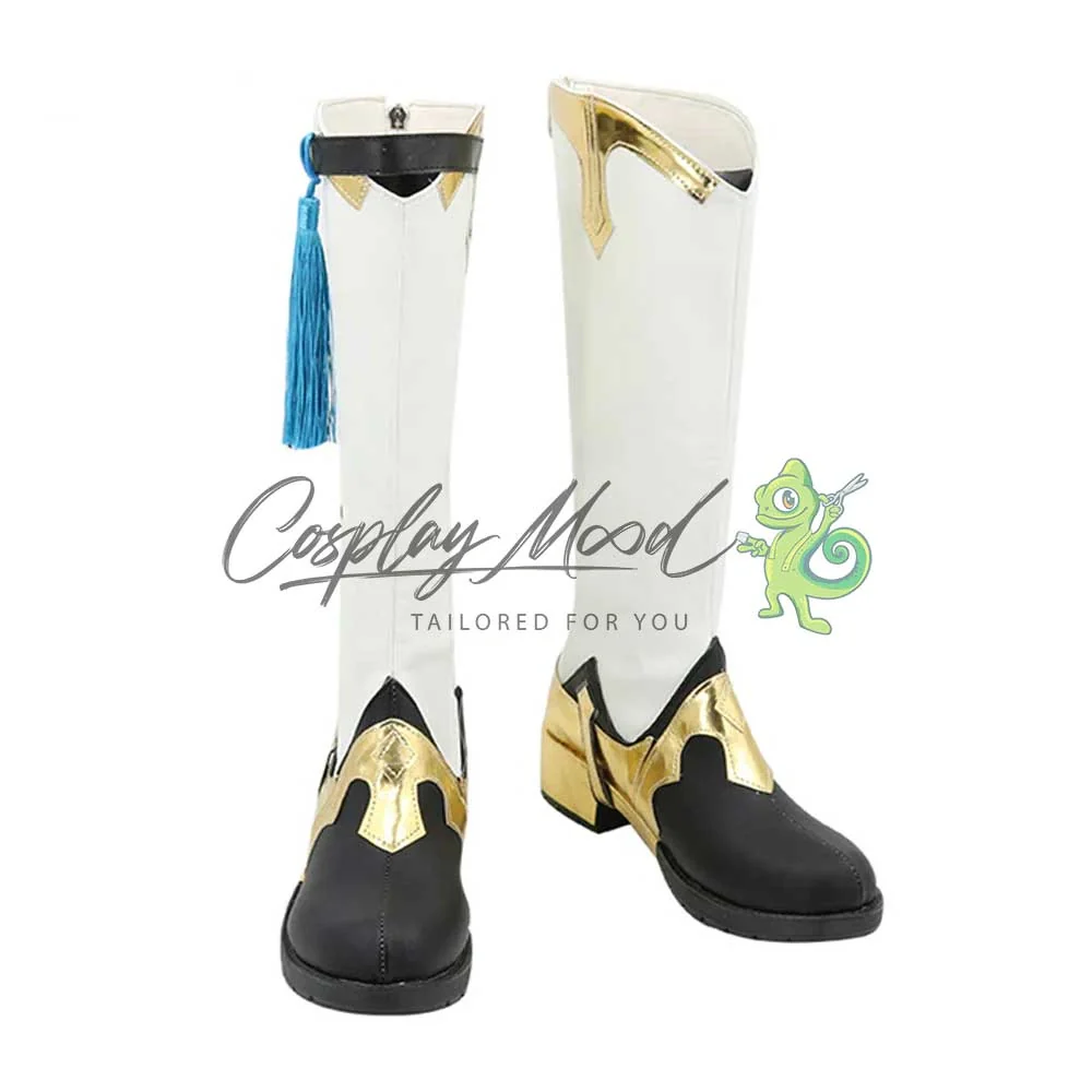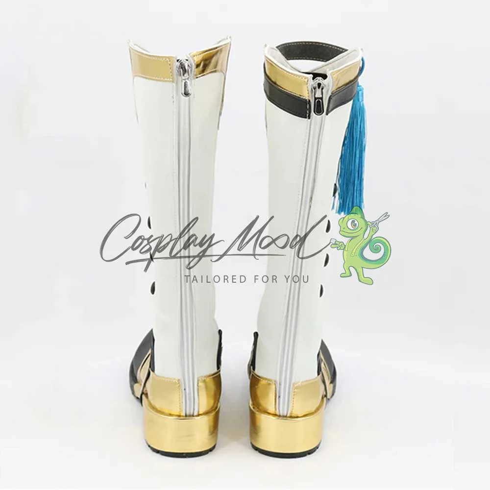 Gli stivali sono realizzati in pelle PU e lavorati con dettagli tipici del personaggio in questione. Questo tipo di calzature sono resistenti ad urti e strappi ed appariranno come da immagine: un paio di stivali lunghi bianchi con elaborate decorazioni dorate sull’apice e sulla parte del tacco e del tallone fino alla zona frontale. In alto sulla gamba destra è posto un laccetto nero con un pendaglio azzurro. Sui lati si trovano quattro decorazioni stile bottoncino dello stesso colore delle punte.