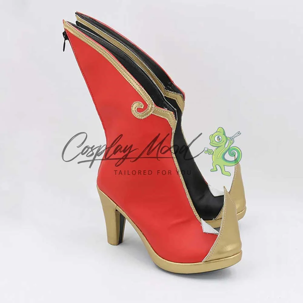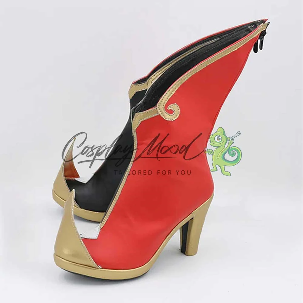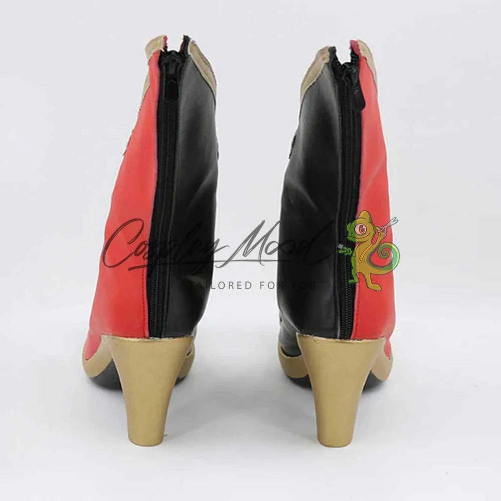 Gli stivali sono realizzati in pelle PU e lavorati con dettagli tipici del personaggio in questione. Questo tipo di calzature sono resistenti ad urti e strappi ed appariranno come da immagine: un paio di stivaletti dal profilo obliquo con una netta divisione tra parte rossa e nera. I tacchi, le decorazioni e le punte curvate all’insù sono di colore oro.