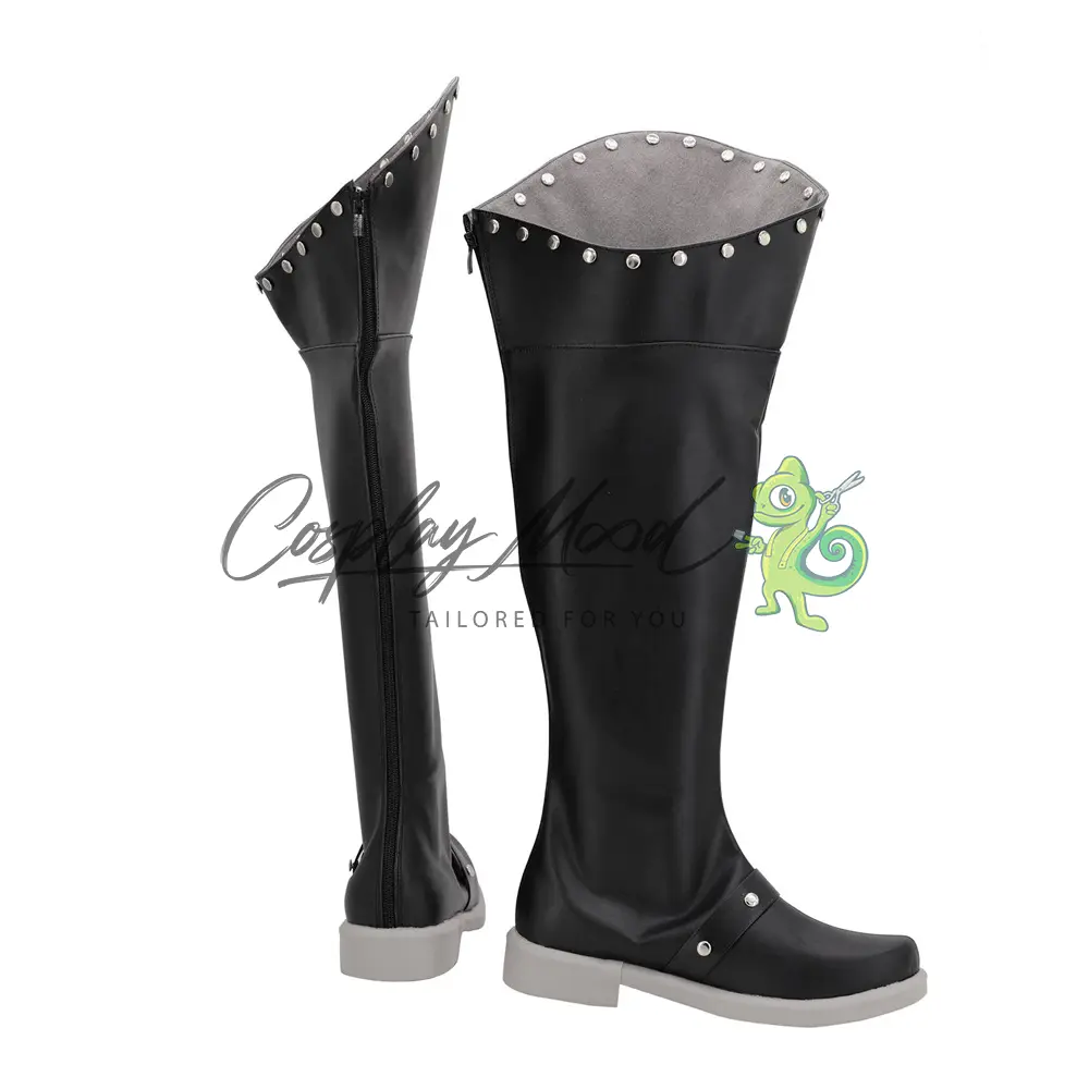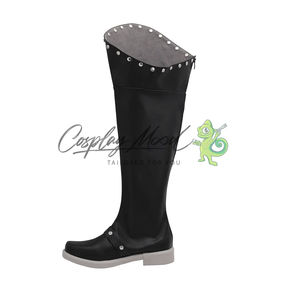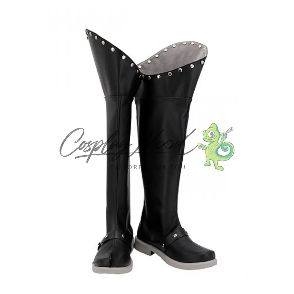 Le scarpe sono realizzate in pelle PU e lavorate con dettagli tipici del personaggio in questione. Questo tipo di calzature sono resistenti ad urti e strappi ed appariranno come da immagine: un paio di stivali neri lunghi con apertura ampia al margine superiore e una serie di bottoncini argentati decorativi. Nella parte bassa si trovano due strisce nere con gli stessi bottoncini posti in alto, infine la suola ed il tacchetto sono grigio caldo che è lo steso colore usato nel rivestimento interno. Gli stivali cosplay sono fatti su ordinazione, quando il laboratorio finisce di realizzarli verranno spediti immediatamente. Potrebbe accadere che alcuni tipi di scarpe o stivali all’inizio possano avere un forte odore che per alcune persone potrebbe risultare sgradevole. Questa cosa si risolverà facilmente mettendo le scarpe o gli stivali in un luogo areato per qualche giorno.