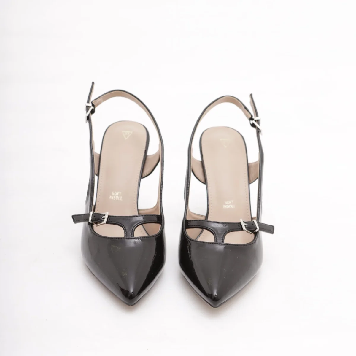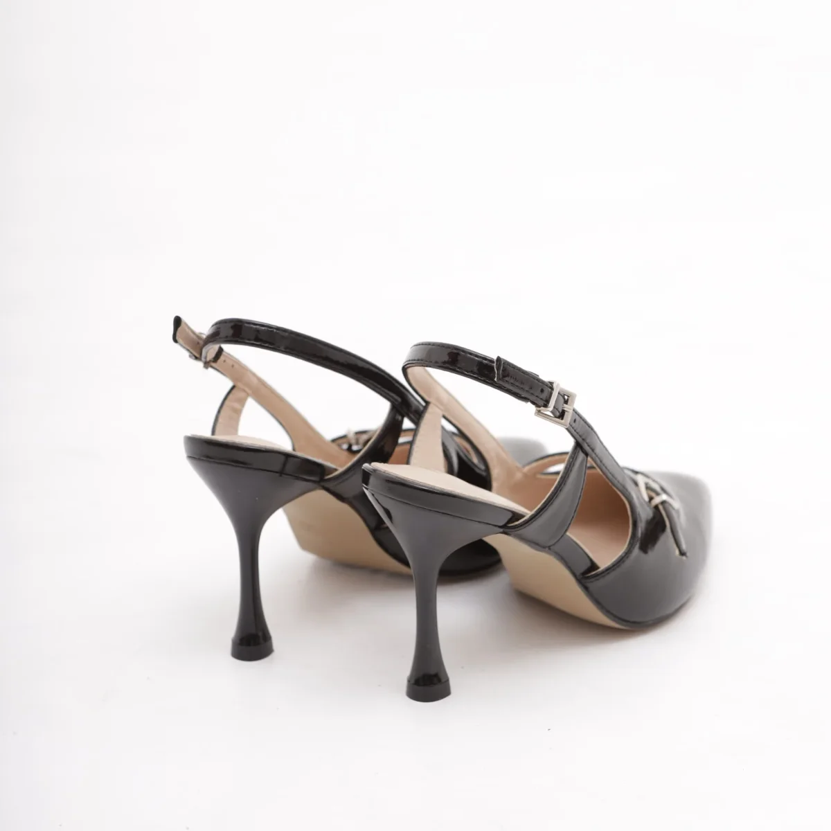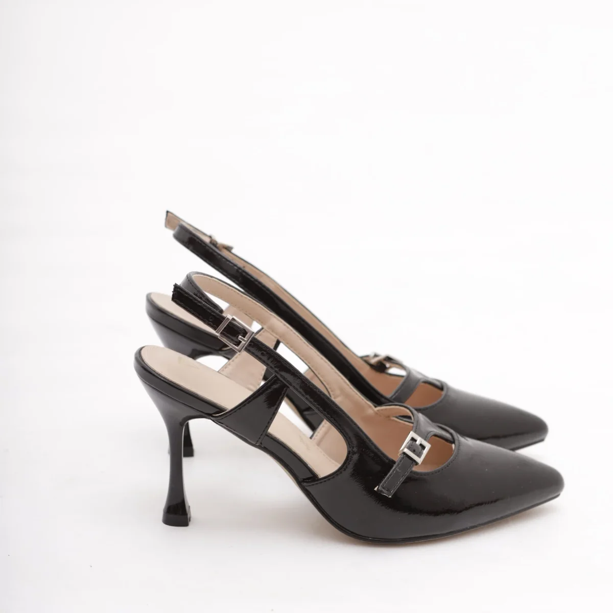 Scarpa con tacco in vernice colore Nero. Con dettaglio dorato sul tacco e cinturino alla caviglia regolabile. Disponibile anche in Beige.