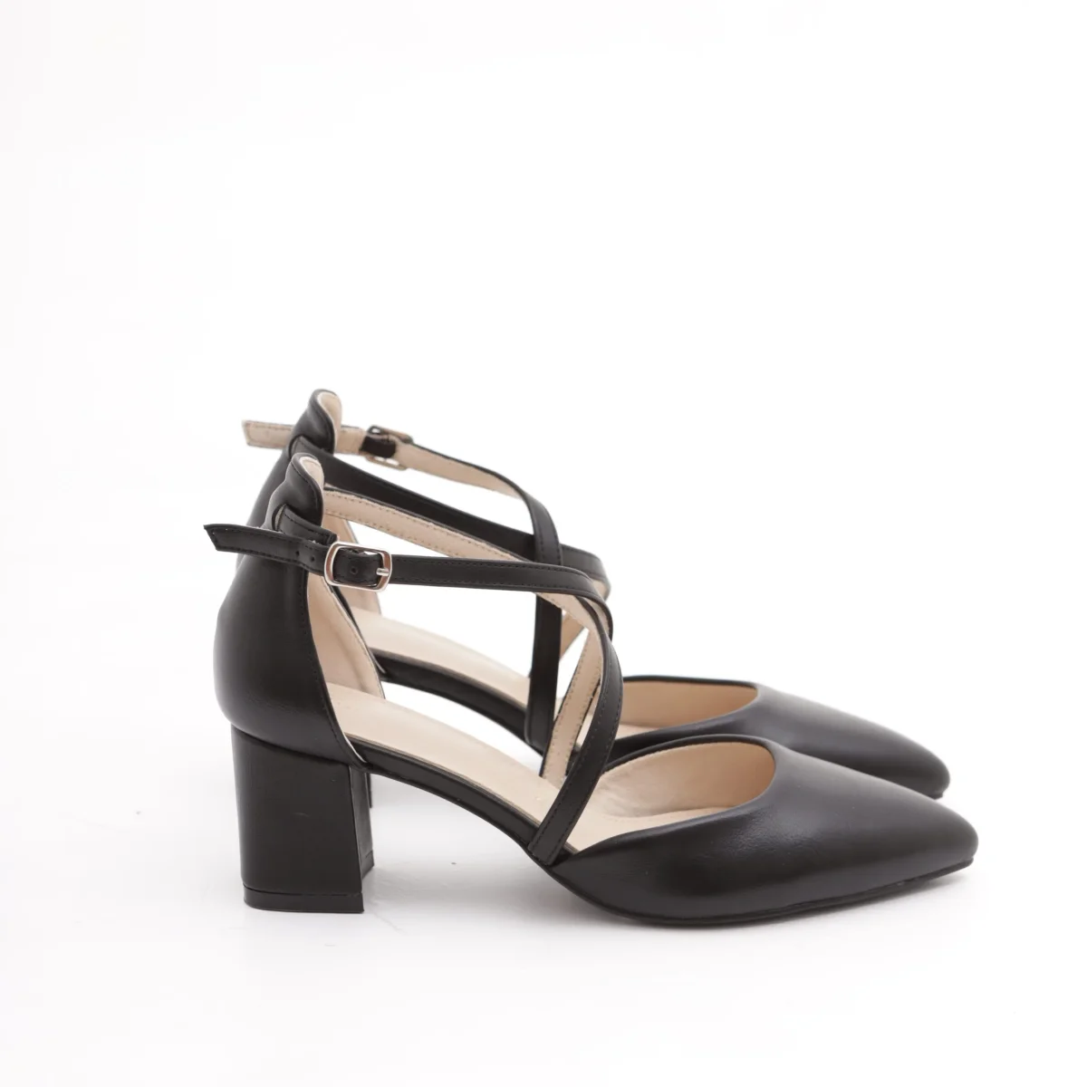 Scarpa con tacco in vernice colore Nero. Con dettaglio dorato sul tacco e cinturino alla caviglia regolabile. Disponibile anche in Beige.