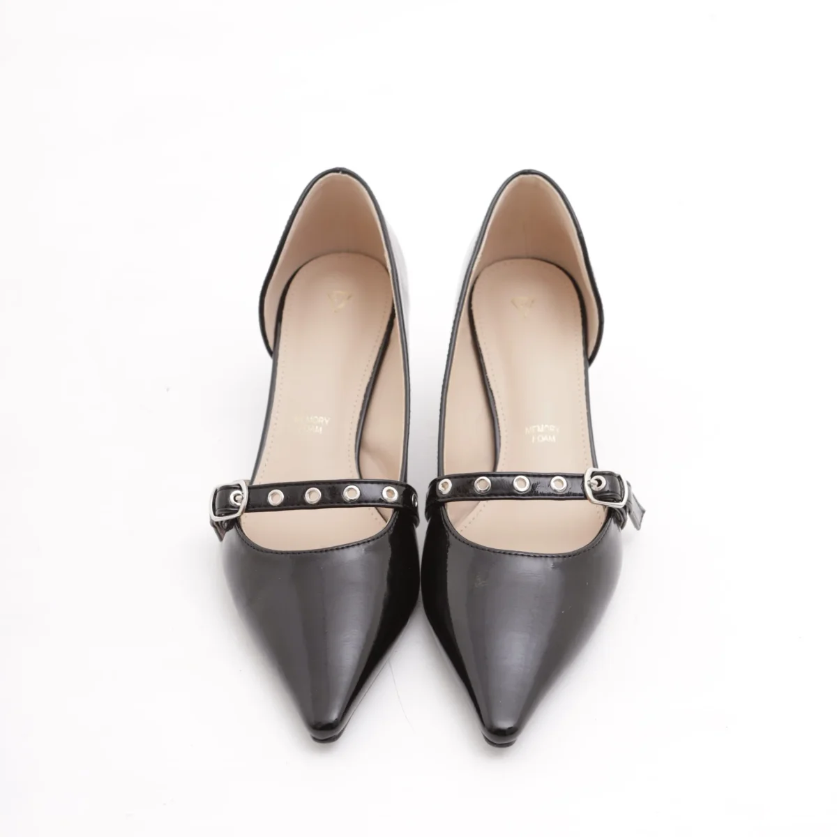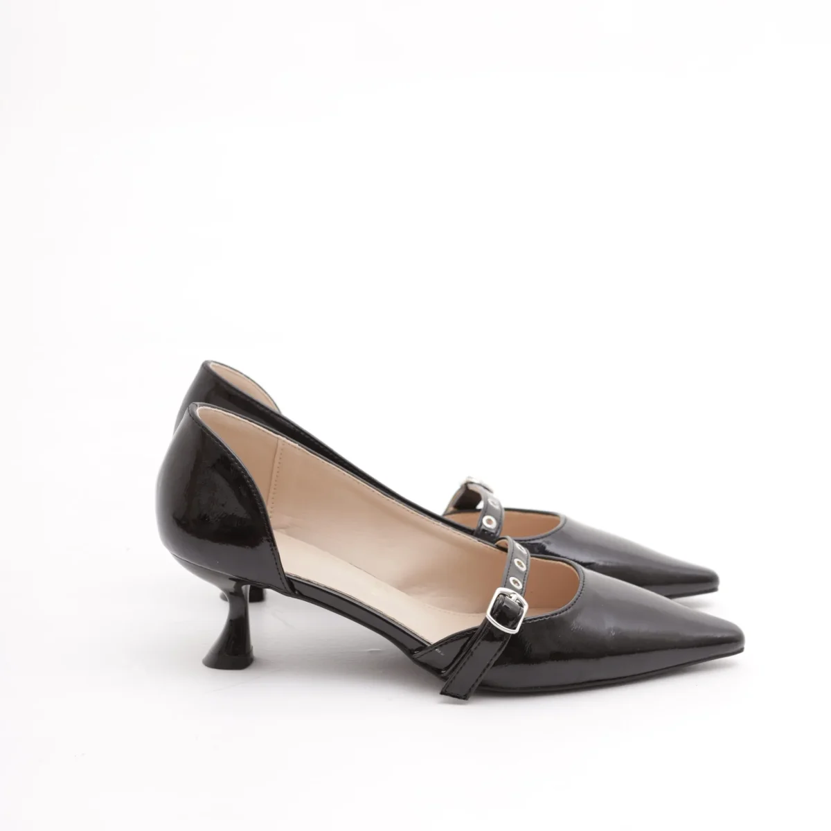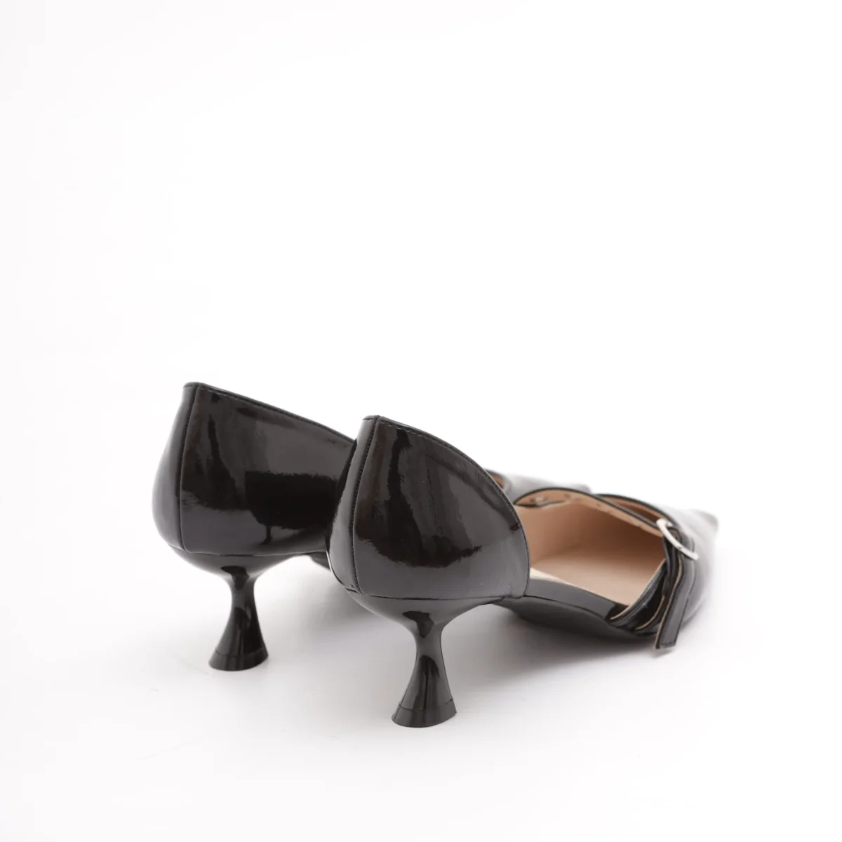 Scarpa con tacco in vernice colore Nero. Con dettaglio dorato sul tacco e cinturino alla caviglia regolabile. Disponibile anche in Beige.