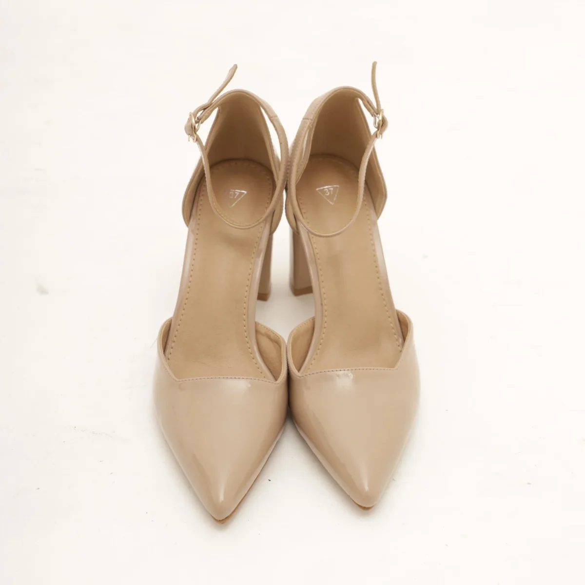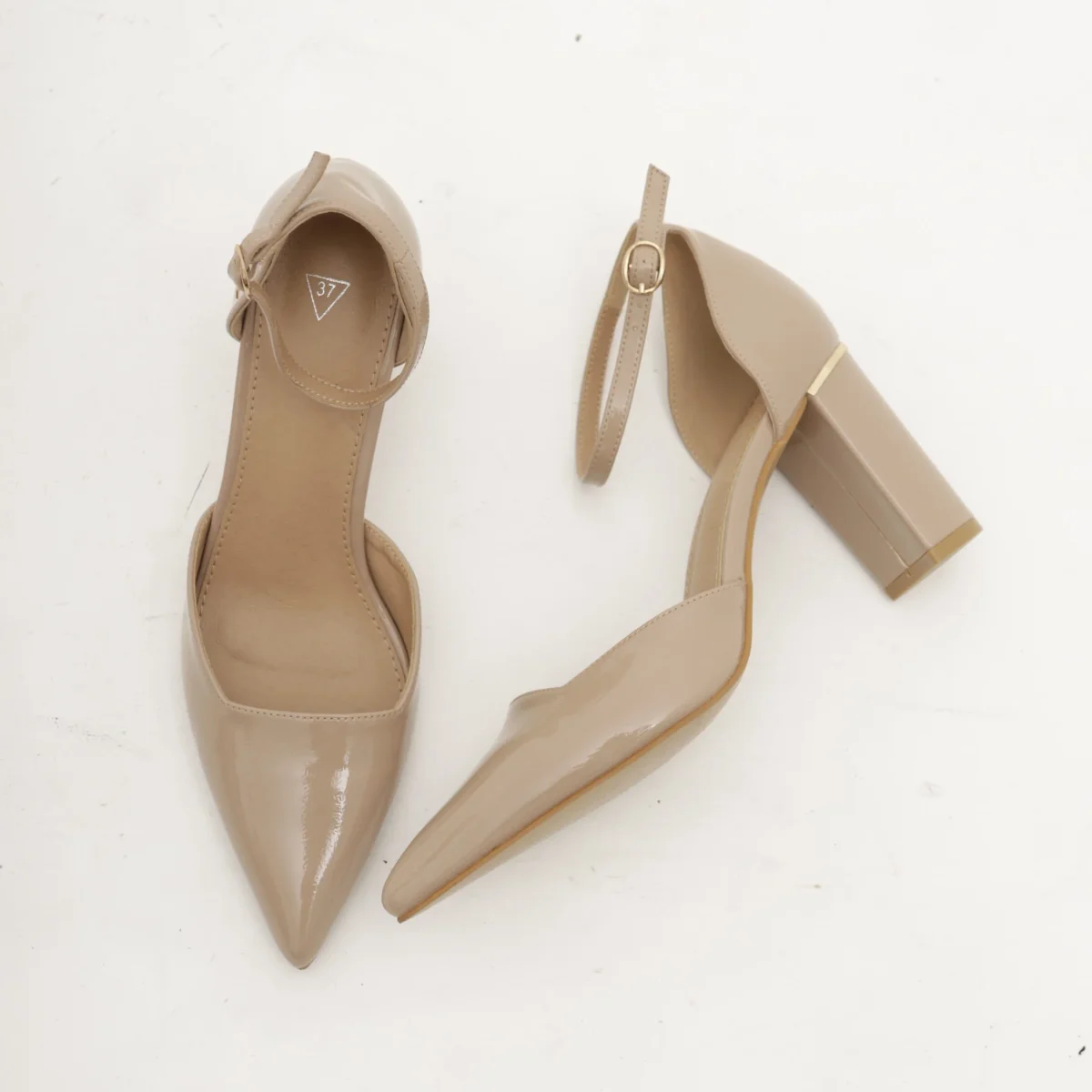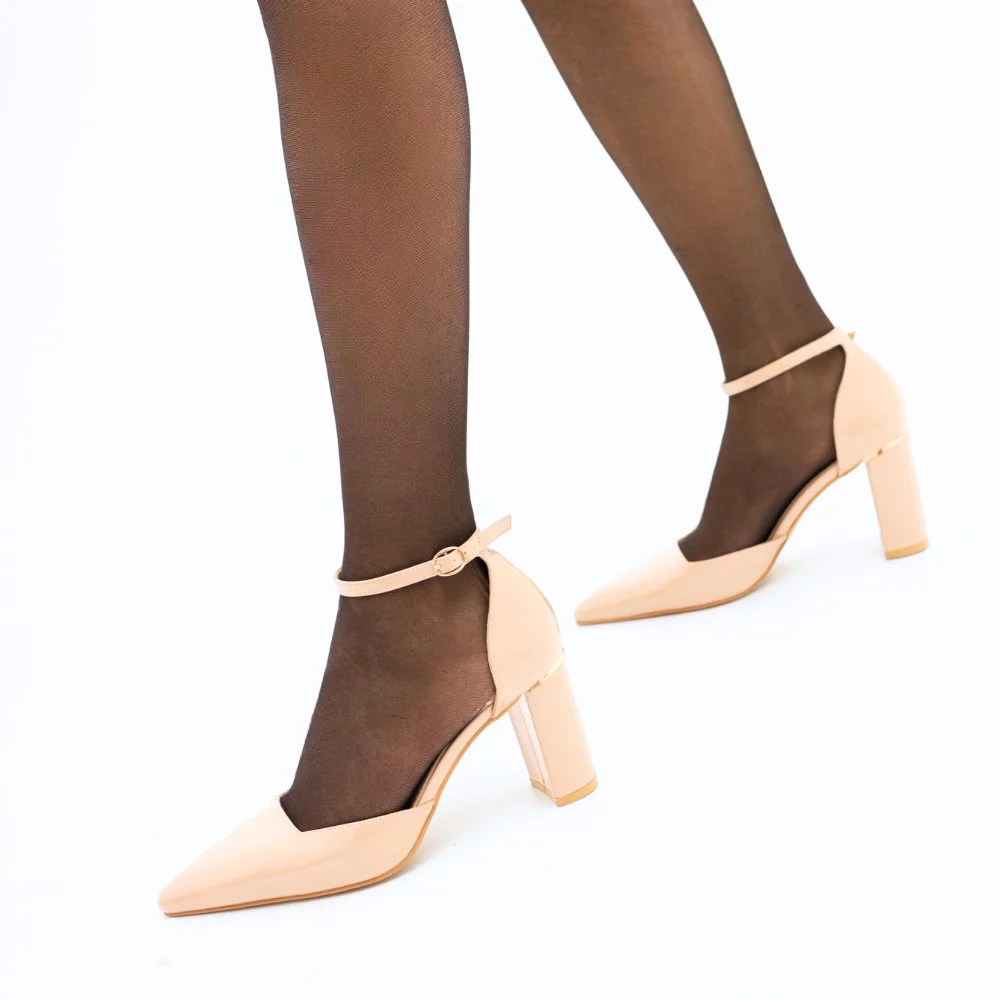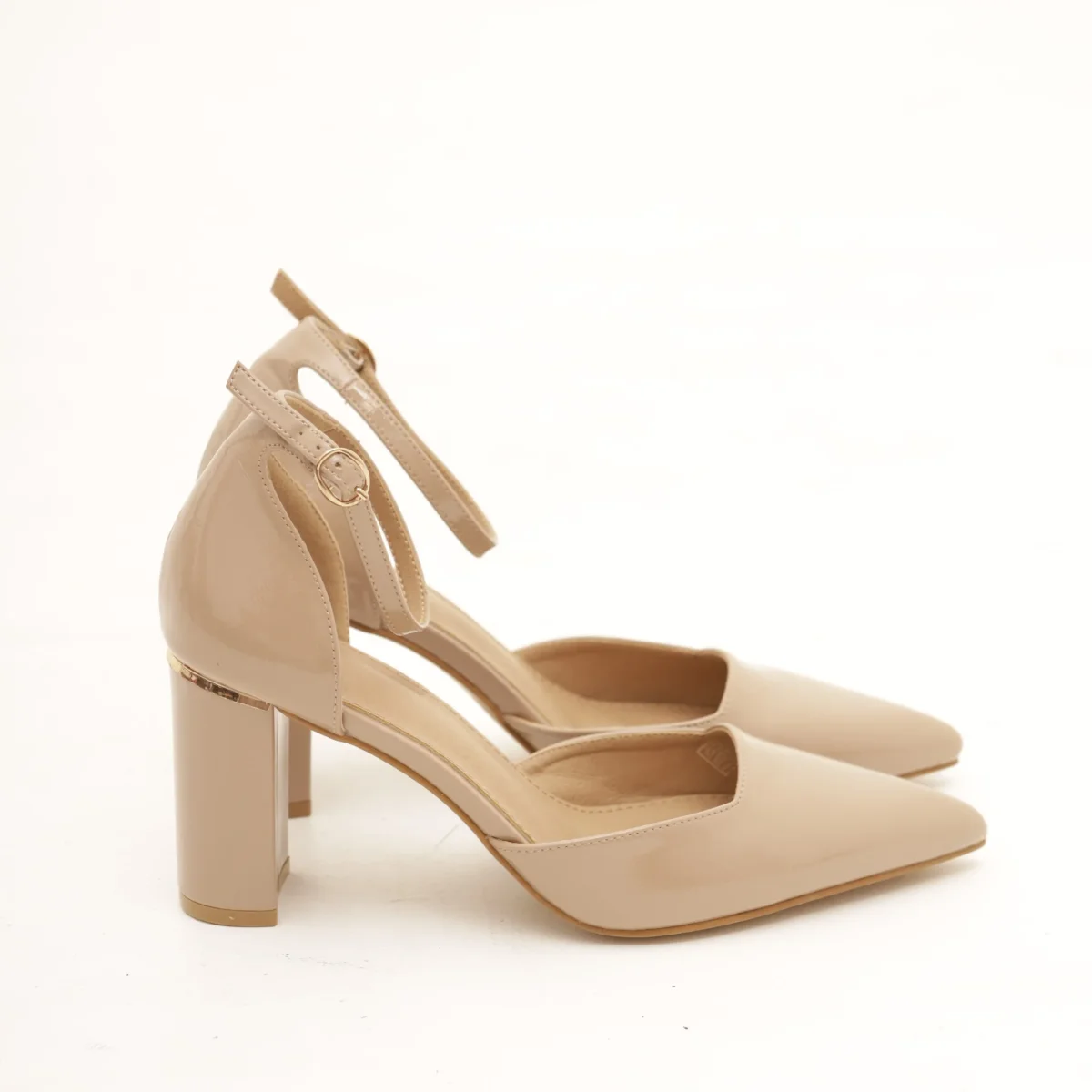 Scarpa con tacco in vernice colore Beige. Con dettaglio dorato sul tacco e cinturino alla caviglia regolabile. Disponibile anche in Nero.