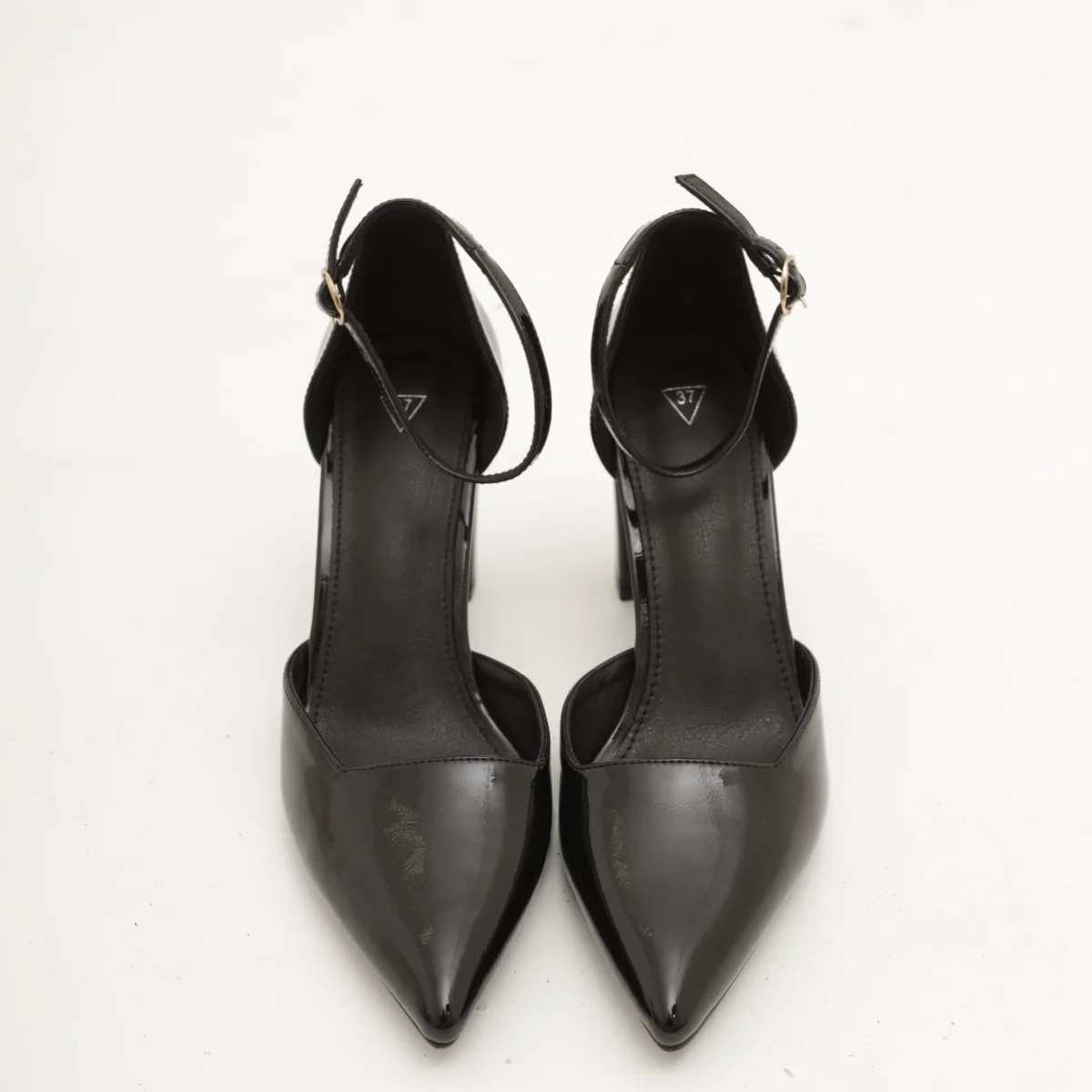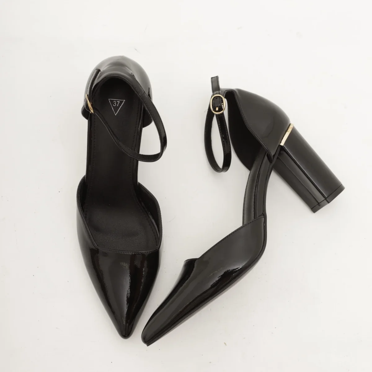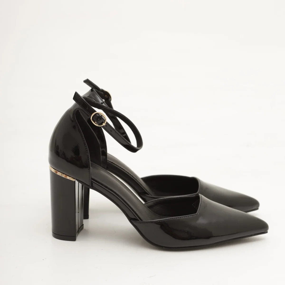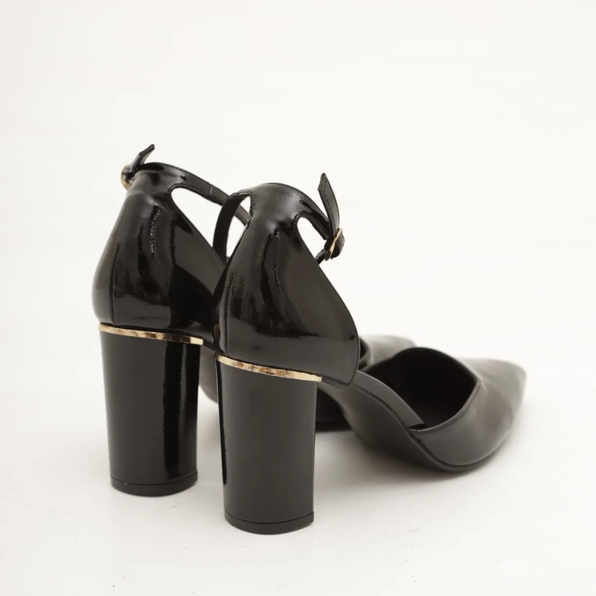 Scarpa con tacco in vernice colore Nero. Con dettaglio dorato sul tacco e cinturino alla caviglia regolabile. Disponibile anche in Beige.