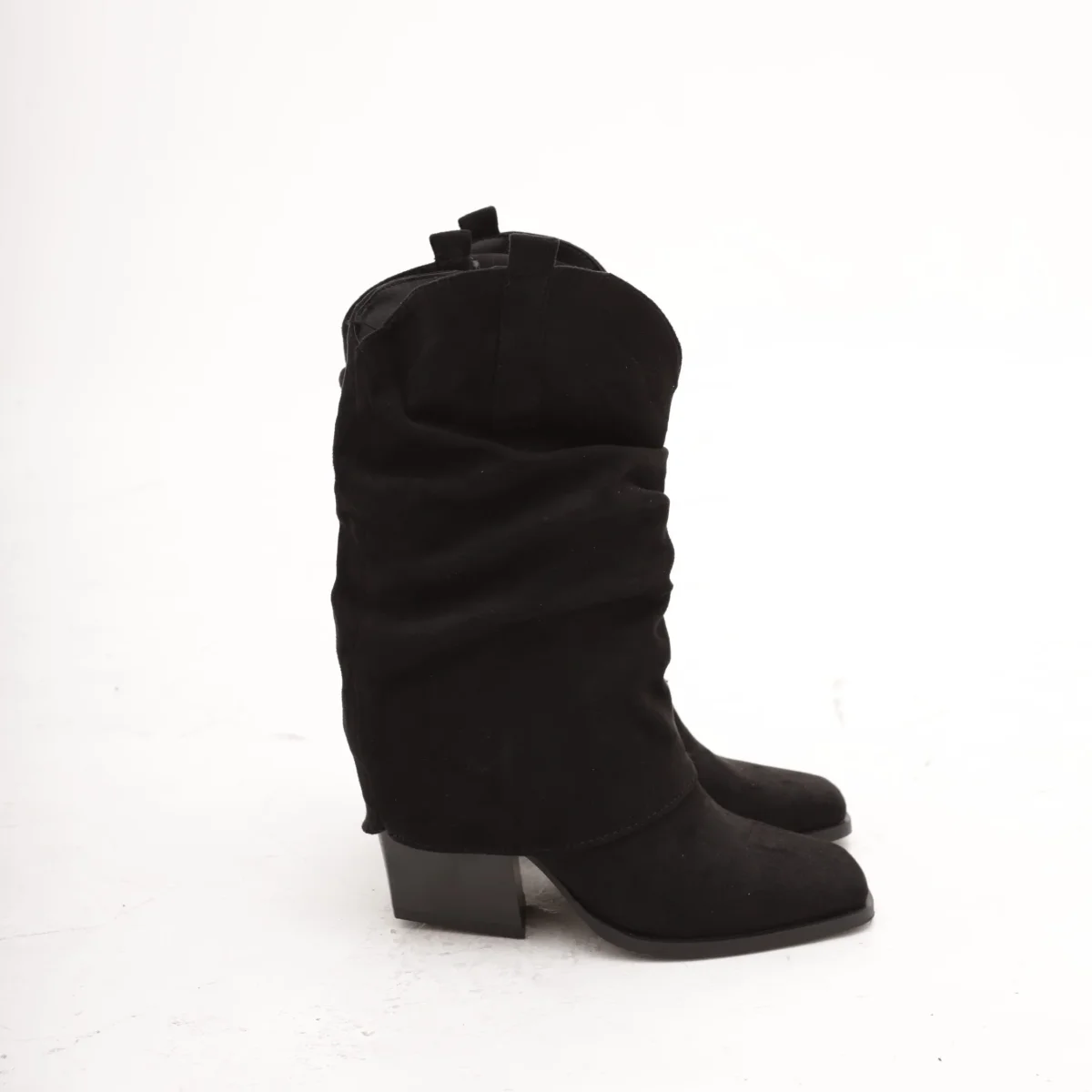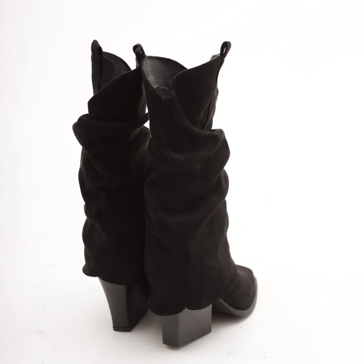 Modello Stivale realizzato in simil-camoscio Nero. Gambale largo risvoltato. Disponibile anche nel colore Tortora.