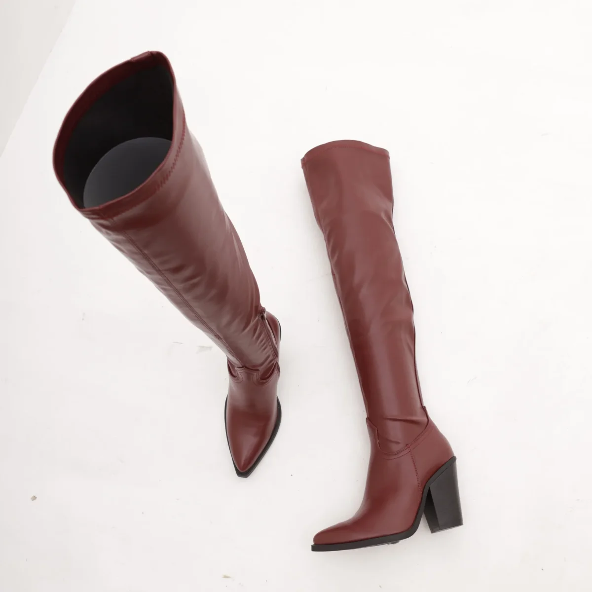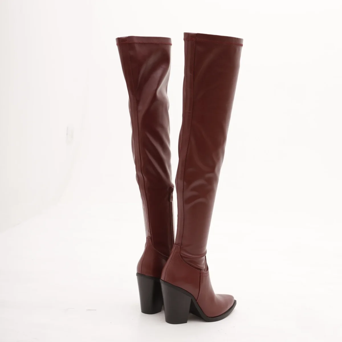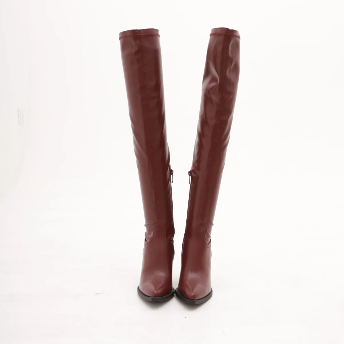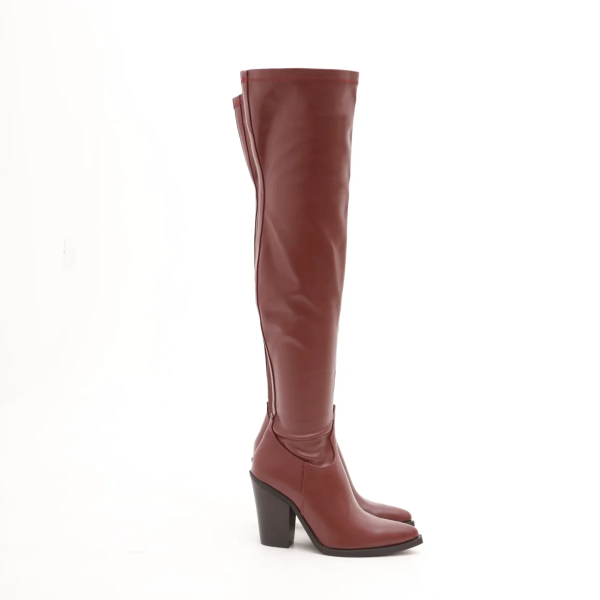 Modello Texano alla coscia realizzato in eco-pelle Bordeaux. Modello molto aderente. Chiusura con zip nella parte interna laterale. Disponibile anche nel colore Nero.