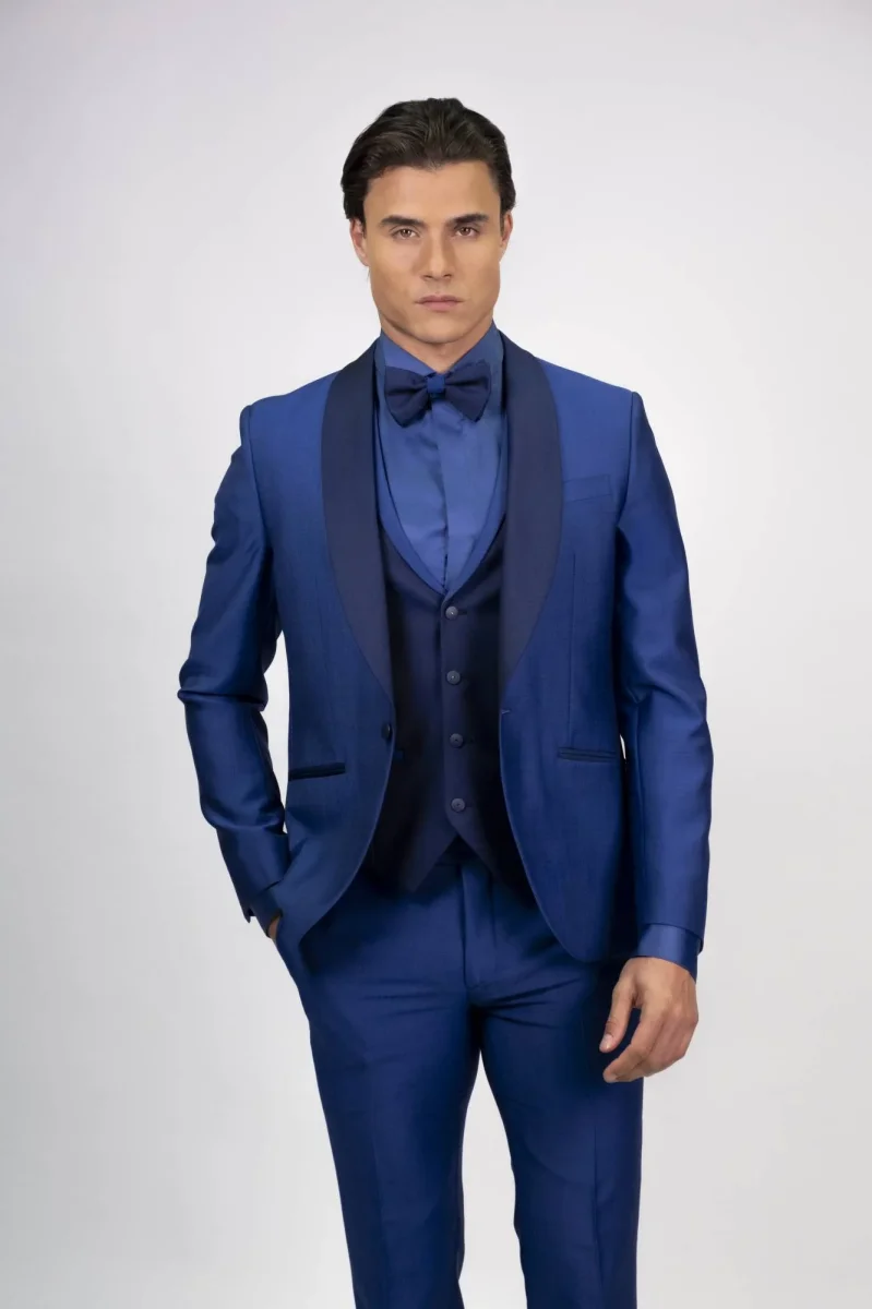 La giacca monopetto, con caduta pulita e una vestibilità slim confortevole che valorizza le spalle e slancia la figura, è definita dall’iconico collo sciallato in raso, tasche a filetto e chiusura a un bottone; il gilet coordinato scolpisce il punto vita, mentre il pantalone sartoriale a gamba affusolata completa l’insieme con rigore formale. Bottoni gioiello, impunture discrete e fodere traspiranti testimoniano una cura sartoriale di alto profilo.
