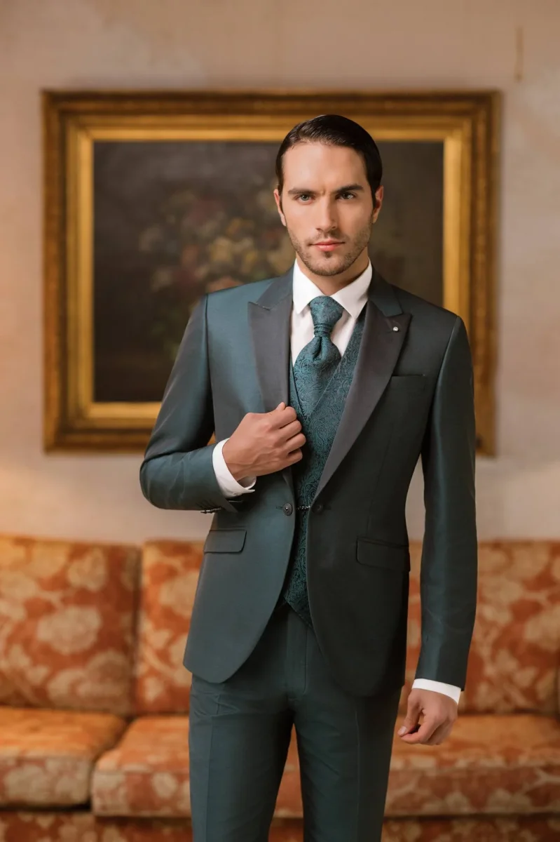 Il coordinato include un gilet e un cravattone verde damascati, che donano profondità e ricercatezza al look, grazie al delicato motivo jacquard tono su tono. L’insieme crea un equilibrio armonioso tra tradizione sartoriale e modernità, ideale per chi desidera un outfit cerimonia sofisticato e unico.