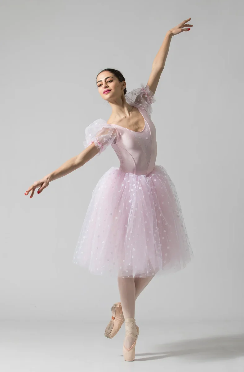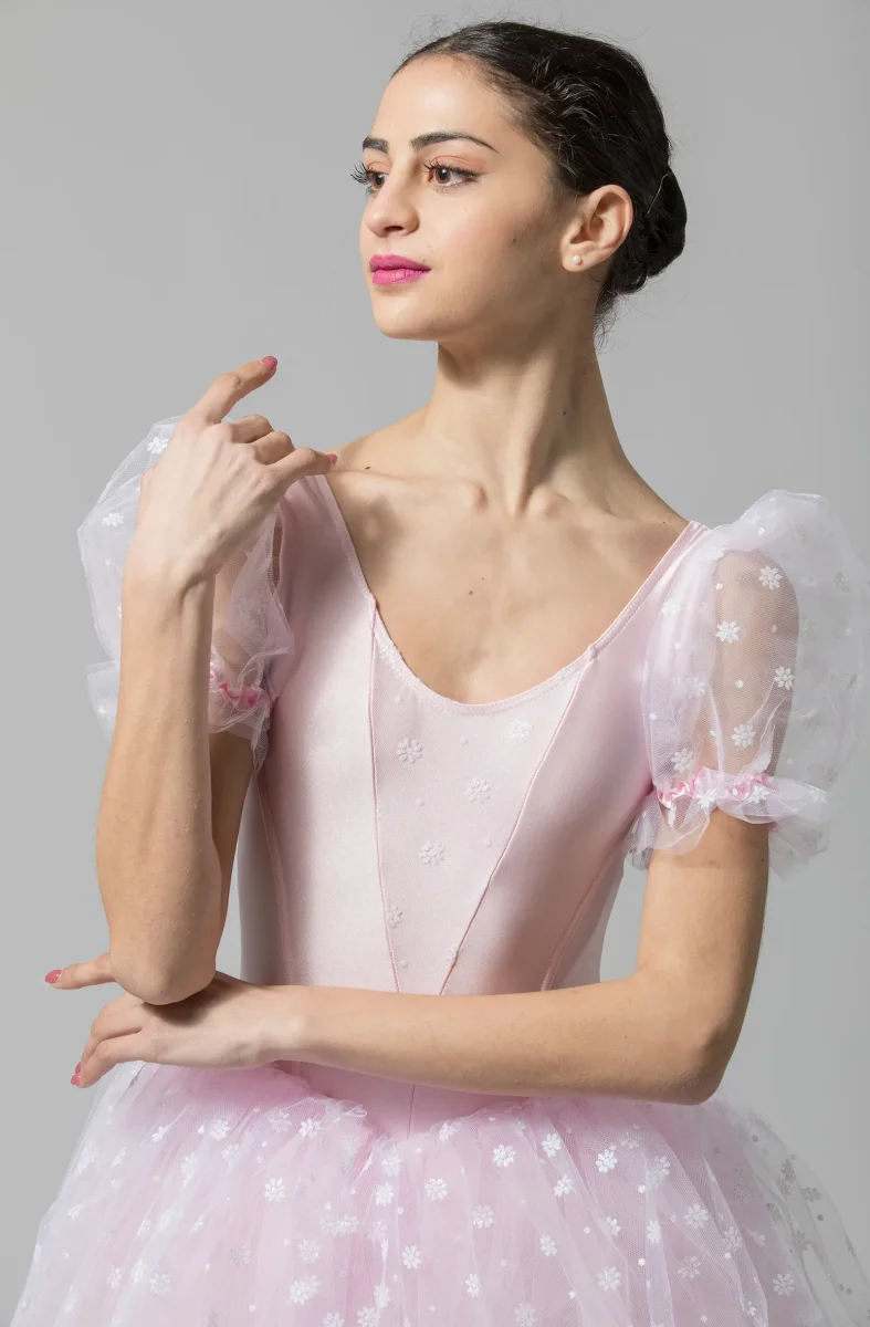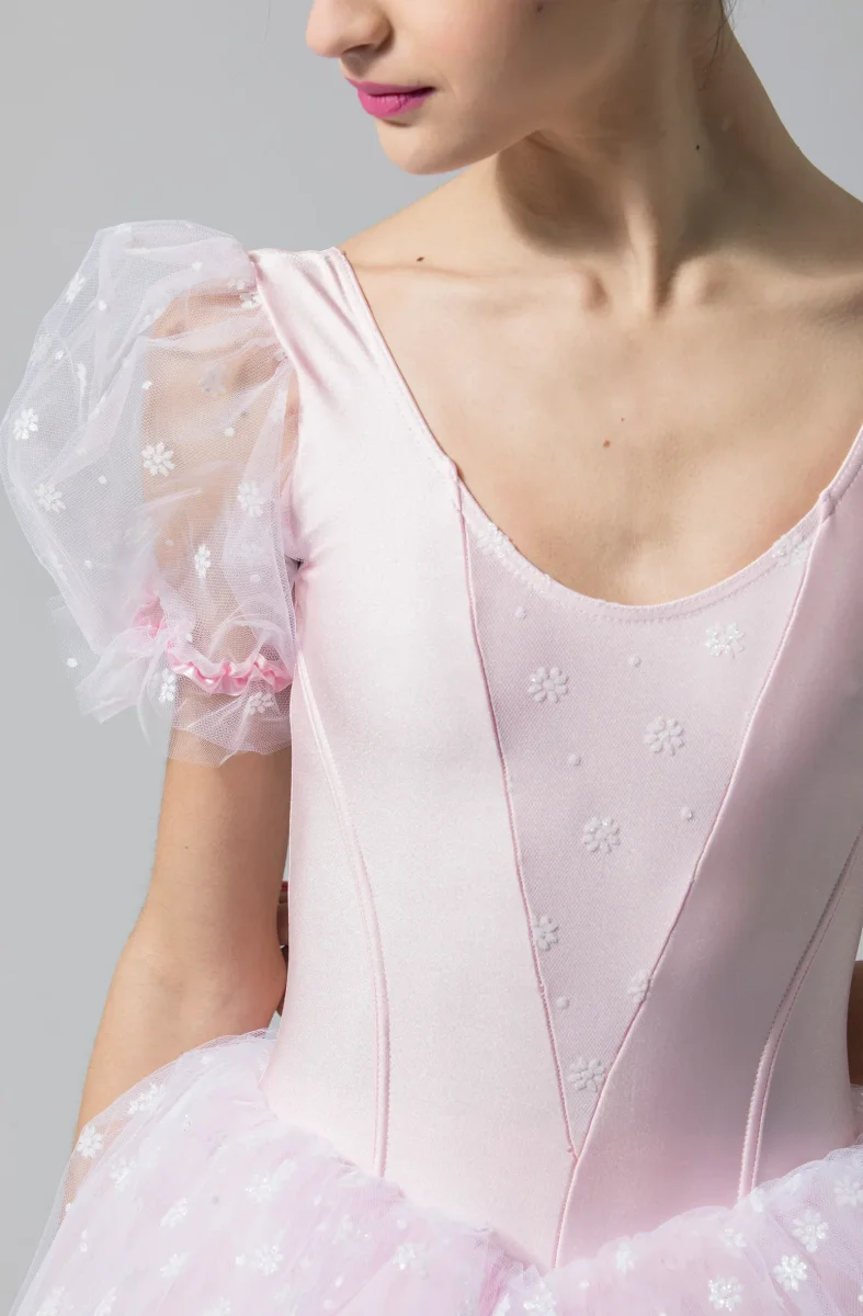 Degas con maniche a doppio palloncino, bustino con lancia, rifiniture di tulle madreperla