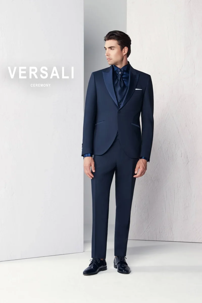 La giacca presenta il collo lancia in raso, dettaglio distintivo che conferisce luminosità e carattere all’insieme. L’abbinamento con il gilet e il cravattone in raso tono su tono crea un effetto sofisticato e armonioso, esaltando la silhouette con linee pulite e impeccabili.